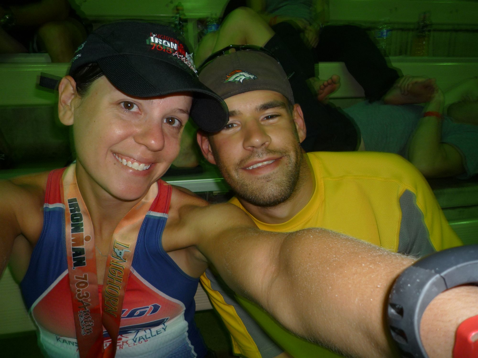 Comments: The course had runners come through the arena to begin the run - which was pretty cool. Lots of cheers and such, but I did notice the stench already - wheeeee-eewwww! The sun was in and out on my first loop, and I was just trying to find a rhythm. Usually it takes me 2 or 3 miles to warm up on a 70.3 run, so I just kind of waited for it. My goal was to run 10s or 10:15s, which is why I was wearing the garmin to help pace me. The first two miles were just over 10s I think, and I felt good about that. But I was still waiting to hit a groove, and I just... never... did. My legs were heavy and tight, and my heart rate was HIGH. I ran almost all of the fist loop and decided to eat a gu between miles 3 and 4 to see if that would help. But I was just not feeling so hot when I came around to start the 2nd loop. My hamstring-back-of-the-knee thing was bothering me a lot. I saw Tom though, and that really boosted my spirits. I told him my leg hurt and he suggested striding my legs out a bit to loosen them up. He ran with me for a few steps and then I was off for the 2nd loop. The 2nd loop was mentally pretty tough. I walked up all of the hills, but tried to keep running inbetween. The aid stations were great - but some of them were spaced really close together. I couldn't figure that one out, but I guess better to have too many than not enough? They had lots of great stuff - the normal gels, bars, and drinks, but one had ice cold wet towels - a few had Coke - one had frozen strawberries - really well stocked run course with fun costumes and lots of energy from the volunteers. The sun was hitting me hard on the 2nd loop, and my energy was fading fast. I popped an Enduralyte at one of the aid stations and gagged on it a little - it nearly came right back up. Decided not to take another for fear of vomiting - my tummy was doing some weird stuff it never ever does. Just felt volitile; I wasn't sure whether I needed to pee (hadn't yet), poop (TMI!), or puke. U2 was playing at one of the aid stations which really pepped me up, but after that it was really quiet and a runner even commented beside me how quiet it was. He was right... there were hundreds of people shuffling along the course, but no talking, no laughing, no noises. Just quiet shuffling. It was kinda weird. At this point I had abandoned my goal time and was just trying to run as much as I could. I knew Tom would be waiting for me and that powered me on the last mile of the 2nd loop. I saw him and told him my tummy was acting funny and that I'd been walking and that I was upset about that. He said "well don't walk anymore!" and told me I could do it and he'd see me in the arena at the finish line. OK. Last loop. The last loop I just tried to hang on. I was falling apart fast, and doing a run/walk combo at best. I was drinking a lot, but didn't feel like eating anything at all. Still didn't have to pee, which probably means I didn't drink enough on the bike. And I don't know who these people are, but there were a ton of people with tops on that said "Fueled by Beef" and every time I saw one I thought about beef and felt nauseous (I'm vegetarian). Yuck. I kept leapfrogging one of them and literally had to make myself NOT look at her jersey. Anyway, finally I came up to the sign that said "2nd and 3rd loops left, FINISH right" and I got to go right. Lots of energy and crowd here - this was it. This was the arena finish! As I came inside my eyes were blasted by what seemed to be darkness, but it was just darker than it was outside. I had to blink hard a few times to adjust, but when I did, I saw all of the people cheering, and made my way around the loop. I saw Tom with the camera (all though me missed getting my photo here), and kept running around the loop. Finally to the straight away, exhaled a deep breath, and was glad to be done with this race and this season. About 3 feet from the finish line, two guys sprinted past me - one on each side - and completely ruined my finish photo. You literally can not see me at all in the photos, they engulfed me at precisely the finish line. Booo them. But hey. I was done. I immediately started crying because I'm a girl and also because I was pretty upset about the run. I stumbled past people handing me a towel, a water bottle, a medal, a finishers hat. So much stuff in my hands. Found Tom and he thought I was happily crying, but I wasn't. I was kinda upset. He calmed me down and insisted I did great. I fianly calmed down and realized I did do pretty well, considering everything. What would you do differently?: You know, after 4 seasons and 18 triathlons, I'm a little frustrated that I still don't have down one of the most fundamental and defining aspects of triathlon... running off of the bike. I know I pushed the bike in this race, and I feel like I really paid for it on the run. I obvioulsy need to do more LONG rides, and more BIG bricks if I want to do well in a 70.3 run in the future. ![]() Post race