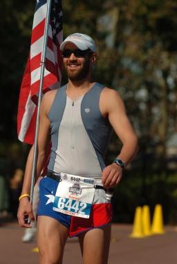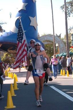 Comments: Haley was already banged up from the previous day's race as well as being horribly under trained, so the plan was to use a run 10 walk 1 strategy until mile 20 where I'd go ahead and run the rest of the way in and wait for her at the finish. The day starts out simple enough. We're following our race plan and running miles at about an 11:00/mile pace. I decide to ditch my sweatpants right before we head into Epcot so that the photographers can see my race number. Unfortunately Haley doesn't even make it another 1/4 mile before she has to pee. Luckily there was a real bathroom open in the park so we stopped. Some random guy had me stand on a bench with Epcot in the background and pose with his wife for a photo. I wonder how that turned out? We start out again and make our way past the Christmas tree. The tunnel we ran through was all lit up with Christmas lights and looked really cool in the morning before the sun came out. We merged back together with the other starting wave as we passed mile 3 and left the park. Headed back along the highway past where we started and were on our way to the Magic Kingdom. Somewhere along the way I missed a mile marker and didn't get my actual split for mile 3. Haley seemed a little too excited when she informed me that her watch keeps splits as well. "Well congratulations!" This became the first in a long day of giving Haley shit for just being her. At first it was for my own amusement, but as the day wore on I actually had to keep it up for Haley's sake. More on that later. So the shit-giving game went back and forth for a while. I had done more than my share of idiotic things already that weekend and Haley seemed intent reminding me of every single one of them. That was the last straw. Somewhere past mile 5 I had to let her know the ugly truth. Jess and Haley had posed for a bunch of pictues in their new swimsuits the night before in the hotel (Sorry guys, those aren't getting posted; you should have been there!) and Haley had been very concerned over how big her butt looked in one particular photo. Naturally we all told her it was all in her mind at the time (her ass looked HUGE!). So at mile 5 the great game of "how many fat ass jokes can I tell about Haley" begins! I would try and remember some of them, but there were just to many. In fact, for the rest of the RR, just insert your own jokes about Haley's fat ass after every sentence. That'll give you an idea of the ass joke volume throughout the day. At mile 6 we walked through an aid station, I made a fat joke and a woman jogging past us asked Haley, "Why in the world are you running with this guy?" :) By mile 7 Haley's pace was slowing down and I could tell that this was going to be a really long day for her if she was already having trouble. Half-way through mile 9 we could see the Disney Contemporary Resort (the one the monorail goes through). Well, we could see one very small corner of it; the fog was incredibly thick that day and really kept things from warming up for a good long while. We happened to be talking about Clif Shot Bloks as we passed the resort and then BAM!, we find a pack on the ground! They were opened, but still had a few in the package so we took them and ate what we wanted. Cran-Razz. Excellent. Hit the mile 10 marker and we find a pack of lemon-lime Shot Bloks! Okay, this is just too funny now. So Haley got on the ground to imitate Andrew(Big Red)'s famous "carbo-loading for college students" picture from D.C. and I took a pic with her camera phone. Instant classic. Then she actually did eat the Shot Blok off the ground. That was a little disturbing. But it did help explain how her ass got so huge in the first place. So we made our way through the Magic Kingdom and tried to keep an eye out for the ASI photographer Haley had met at the airport on her way here. He said he would be by the wizard's hat after the castle but we had no idea what we were really looking for and couldn't find him. Oh well. By mile 11 our pace was way off and only getting slower. Haley was stopping at every single aid station and slathering her legs with BioFreeze. I found this especially hilarious as she tried to do this while she walked. It forced her into this kind of waddle motion that reminded me of the Donald Duck adventure from yesterday. As soon as we got out of the Magic Kingdom Haley had to pee again. There weren't any porta-potties in sight but that wasn't about to stop her. So we stopped near some trees and she wandered off into the woods. I waited on the side of the road but I think that a big half naked guy with a huge U.S. flag only drew more attention to the girl peeing the in woods. Oops. Stopped at mile 12 so Haley could pose with a group of military guys along with my flag. I kept telling her it would be funnier if she was dry humping one of the guy's legs, but apparently we needed at least one normal picture for the day. Yeah, I don't get it either. Hit the half-way point in a little under 3 hours. Okay, not too bad of a pace. We could turn a slight positive split and still break 6 hours. If I ran ahead after mile 20 I could even break 5:30, but by mile 14 I knew that wasn't going to happen. This is where Haley really started to hurt. We stopped at mile 14 to stretch and there was no way she was running any more today and I knew it. Her gait was getting worse as we went along and every now and then you could really see the pain in her face. I couldn't leave her behind like that so it was walking for the rest of the day. Only thing I could do to make things any better was to tell more fat jokes to keep her laughing. Hey! Is that another package of Shot Bloks?!? Let's see how much food we can pick-up along the way! Yeah, I was stretching for ways to distract her, but this one seemed to work so I ran with it. Mile 15 and 16 included more bathroom stops for Haley in the woods. This girl really isn't bashful at all. As people would go by and I was just standing there I got used