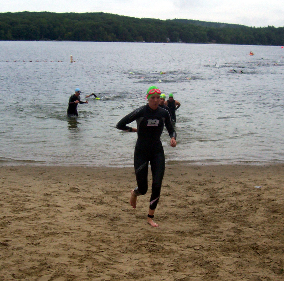 Comments: I was in the 3rd wave, so I stood around and watched everyone else go off. When it was our turn, we all waded in, the gun went off, and so did we. I made a point to start to the right of the front row, because even though I am a very strong swimmer, i get freaked out in the scrum. This tactic worked, as I avoided the flailing, and just did my thing. I saw a bunch of people jump out ahead of me, but I didn't worry. I knew they wouldn't be able to hold that pace (and if they could, good for them!), and I just wanted to swim my own race. By the 2nd buoy I was passing blue caps from the previous wave, and shortly after the yellow caps of the first. I have no idea if i took a wide turn, but I was in no-man's-land between buoys 2 and 3. i didn't see anyone, but I was sighting and new I was fine. I quite enjoyed the solitude. Kept swimming, caught more people and just enjoyed the rest of the swim. I felt awesome the whole time, and didn't push too hard. What would you do differently?: Nada. First start this year where I didn't freak. I'll have to start wide from now on. ![]() Transition 1