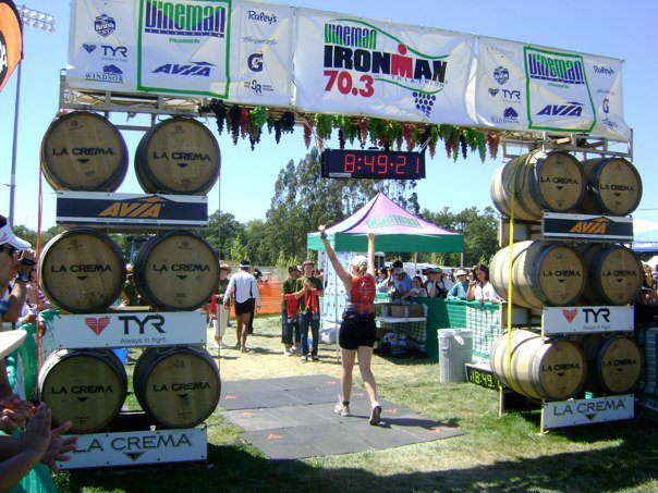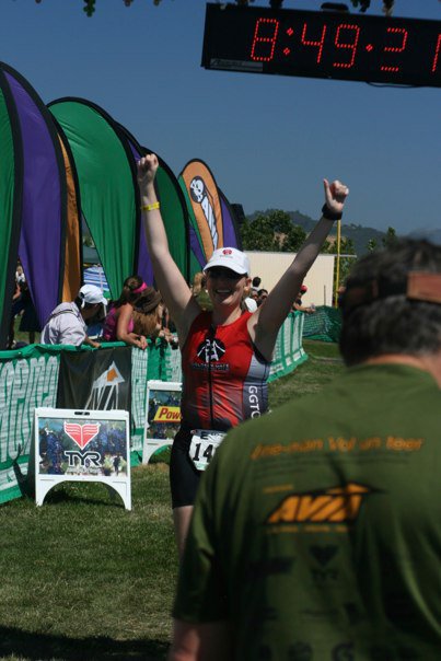 Comments: Went into the run not knowing what to expect. I hurt my foot about 5 weeks before the race and couldn't run. My longest run before I got hurt was 10 miles the day before the injury surfaced, but since then I had been only water jogging for about 2-3 hours a week. The doctor had cleared me to run and said I wouldn't damage my foot at all but I was still uncertain. I started the run at 12:30pm so I knew that I could probably walk the run and still finish within the cutoff in case it started hurting. I started off with a slow, ginger jog. I felt great. Picked it up a bit and still felt great. Realized that I had rocks in my socks from T1 and decided to stop there and dump them out rather than having them become a bigger problem later. Probably lost a minute or two there but it was worth it to be comfortable. From there I just ran. My plan was to try to hold a 10:50-11:50 minute mile while running. I would walk the aid stations and the hills. I just wanted to finish, it didn't have to be pretty or all that fast. I felt absolutely great for the first 4 miles and was elated to roll into the GGTC aid station and see all of my friends. I could hear them from a 1/4 mile away screaming "Margot, is that Margot!?!?!" Two of my best friends from my Wildflower training group (who I'm doing Barb's Relay with) had made a sign for me and were there with water and hugs. At each aid station I drank a cup of water, had a few pretzels and threw one cup of ice down my sports bra, another down my shorts and a final one in my hat. It was hot! From there the course moves into a hotter and totally unshaded section out to La Crema. I was good until I got to the winery but then they were cruel and made us run loops around these little ponds in the winery before we could head back. It was hot and I needed ice more frequently than every mile. I walked more than I would have liked on this part but got a second wind around mile 8. I started chugging along and made it back to the GGTC aid station and my friends at mile 9. They were playing my favorite Lady Gaga song for me and it perked me up a lot. From here I knew I had just a bit more to go. At mile 10 one of my training partners both from TAG and HIT caught me and he pushed me to run the next mile or so. He is a strong runner and I just tried to hang with him as long as I could before I told him to go and that I would see him at the finish. At this point my right foot was soaked from the ice melting down my legs and I was getting painful blisters. I decided to stop and take my socks off and that helped a ton. The last two miles were not pretty. I was running a 13:00 mile which was physically the fastest I could go at that point. At the one mile to go marker I started crying because I was so happy. I was shocked that after being worried about the run for the past 5 weeks due to my injury that I was able to put together a pretty good run for me. This was only 25 minutes off my stand alone Half Marathon time. I turned the corner into the high school and I knew that only a parking lot stood between me and the finish line. I got choked up knowing that four years ago I was sedentary and 55 pounds heavier, and now here I was about to finish my first Half Ironman. I had a huge smile plastered across my face as I ran across the finish line. What would you do differently?: Nothing, I ran as well as I could given my limited run training leading up to the race. ![]() Post race