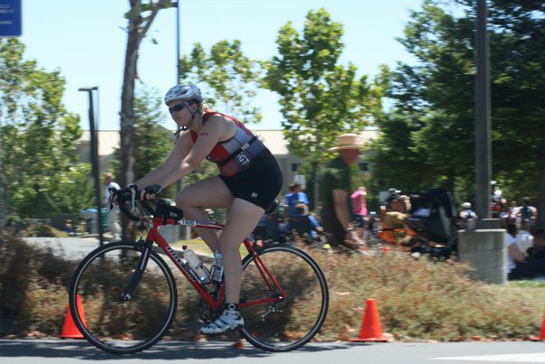 Comments: I never thought I would ever say this, but the bike was my favorite part of the race! Started off on River Road and it was still overcast and I was cold. Turned on my Garmin since I forgot during transition and just tried to forget the cold and focus on eating my Larabar and starting out the ride nice and easy. My plan was to stay as far right as possible, let the millions of people who were going to pass me pass me and RIDE MY OWN RACE. That mantra stuck with me throughout the entire bike ride. About five miles in there is a very dangerous turn and then a short but very steep hill so my first goal was to get through that part safely. Then I would be on more familiar territory so I could increase the pace. Did fine through there and before I knew it I was getting into the first section of rollers on the course hear Hop Kiln. I took the uphills easy and tried to push the downhills to let momentum work for me. Got passed by a few GGTCers and cheered for them. Before I knew it I was at mile 18 which was the first aid station on Kinley Drive. I was astonished because at this point I was still averaging almost 15mph which is way better than all of my training rides. I got some more water and headed off for my favorite part of the ride. Cruised along with no problems with a hug grin on my face for the next 10 miles or so. Got to Canyon Road which is a looong but very gradual uphill. Discovered that they decided to re-pave the road during the last week with CHIPSEAL! Ugh. The next few miles on Canyon Road were painful from all the vibration and I was pretty annoyed. Finally crested the top and screamed down the descent to the turn onto CA-128. And just like that I was at the second aid station. Stopped to use the porta potty there and stretch my back but I was feeling awesome. Was there probably 2 minutes and then jumped right back on the bike and headed out. The rest of the bike was a blur of happiness. Cheered for GGTCers and other racers as they passed me and just worked on riding my own race. It was hard to not get discouraged by people passing me but as time went on the field started to thin out and around mile 35 I finally passed someone! That made me feel good. Got to the third aid station at the turn onto Chalk Hill Road and mentally began to prepare for the next 10 miles which is always the worst part of the course for me. But surprisingly I felt awesome the whole time. Focused on fueling and getting ready for Chalk Hill. Got to the hill which had me in tears three weeks before and just spun right up it, passing 4 people in the process. The beauty of having a triple! Once I crested the hill I knew that barring a mechanical issue, I was having the ride of my life. Cruised the last 10 miles or so and came into T2 with a huge grin 8 minutes faster than my goal time. What would you do differently?: Absolutely nothing. This was the perfect ride given my current ability on the bike. I know I have lots of room for improvement here but I'm super happy with how this went. Also my nutrition was spot on. Glad I figured out ahead of time that I like solids (Shot Bloks) and water rather than all liquid nutrition. ![]() Transition 2