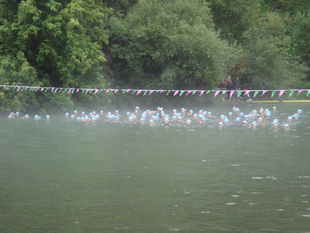 Woke up at 5am on Sunday. Got ready to go, ate my pop tarts and a banana and headed over to the starting line with the family in tow. Parked about a 1/4 of a mile away, and put air in my bike tires. Had a mini freak out when my husband broke off the top part of my valve stem but we were able to get it fixed with no issues. I didn't get to see the pros start the swim like I wanted to but that was ok.