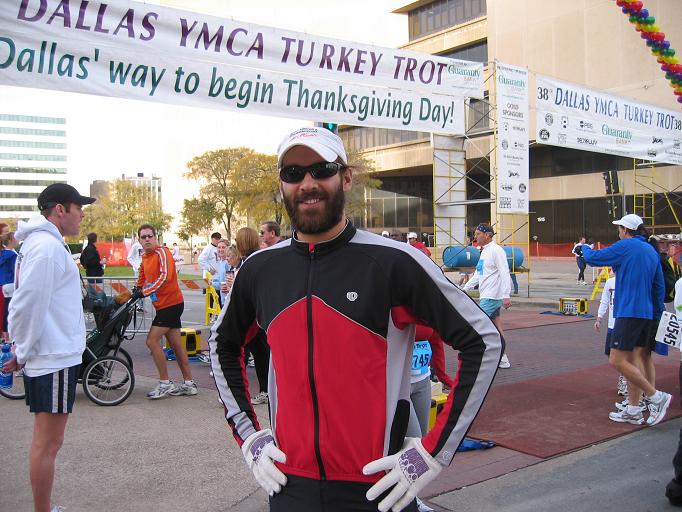 Comments: The crowds were thick and it took us a few mintues to get to the actual starting line. Unfortunately starting at the back meant dodging alot of slow people. The first two miles were nothing but zig-zagging back and forth to try and find a group going my pace. Every time I would pass a group of people I would hear gasps and "OH MY GOD!"s and hysterical laughter coming from everyone I passed. Even heard a few people yell my name. Turns out that one of them was Brandt, but I was feeling good and running fast at the time so I never looked back. After two miles we got into Deep Ellum and the crowds finally started to thin. I was still passing people up a a good clip but everyone was more spread out so I could hold a straighter line. I started to focus more and more on my turnover and breathing and got into a very good rhythm. Finally saw the mile 3 marker and could check my pace. I was just a hair shy of my 5K PR pace and still felt fresh. So I kept pushing to see how long I could keep it up. Running around Reunion Arena I passed a kid wearing nothing but a pair of Texas flag shorts and gave him a little grief for being so overdressed. Hit the mid-way point and was just a hair over half an hour. My "if I have a perfect race" time in the back of my head was one hour flat. I knew that I had a chance to make it but I was already pushing as hard as I realistically could and now needed a 1:00 negative split. This won't be easy. Came to Houston Street bridge and mile 5. A long uphill run and then a long downhill run. This is where I started to loose my focus and I could feel my pace catching up with me. I had been hearing people laugh and cheer and gasp at me all day but suddenly a girl I had just pasted came flying back up and slapped me on the ass as she passed. Now there's a great motivator! I went back to focusing on my turnover again and quickly passed her back. A one hour finish was still in sight. Coming off the bridge I talked for a short bit with a girl who knew me from PrairieMan. I feel so much more at home when I have other triathletes to talk to during a race. I saw David(dgillen) running the opposite direction as I got near the turn around at mile six. Made the turn and knew that I only had to keep this up for two more miles, but my time goal would be really close. Ran into a guy who knew me from Iron Star and antoher guy from Stonebridge Ranch. Mile 7 and I was almost home. I looked at my watch and a one hour finish would mean nearly a six minute mile. Damn. That just wasn't going to happen. So I had to hang on for dear life and at least finish as close to one hour as I could. Enjoyed the looks I got from the crowds as I came down the final straightaway and thought about how nice it would be to finally put some pants on. I missed my goal by less than a minute but did put up a negative split. A 0:01 negative split, but that still counts. I was just happy that I was able to put up a steady pace that was nearly 7:30/mile. What would you do differently?: Not much. I ran strong and steady the whole way. My turkey costume was obviously outrageous and people loved it. Not sure if it will turn into a tradition though. ![]() Post race