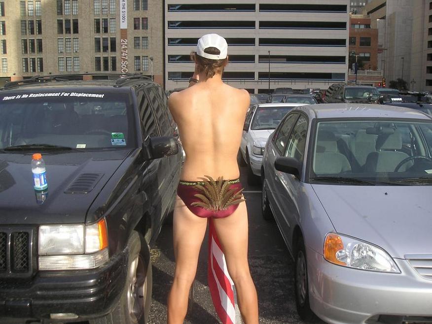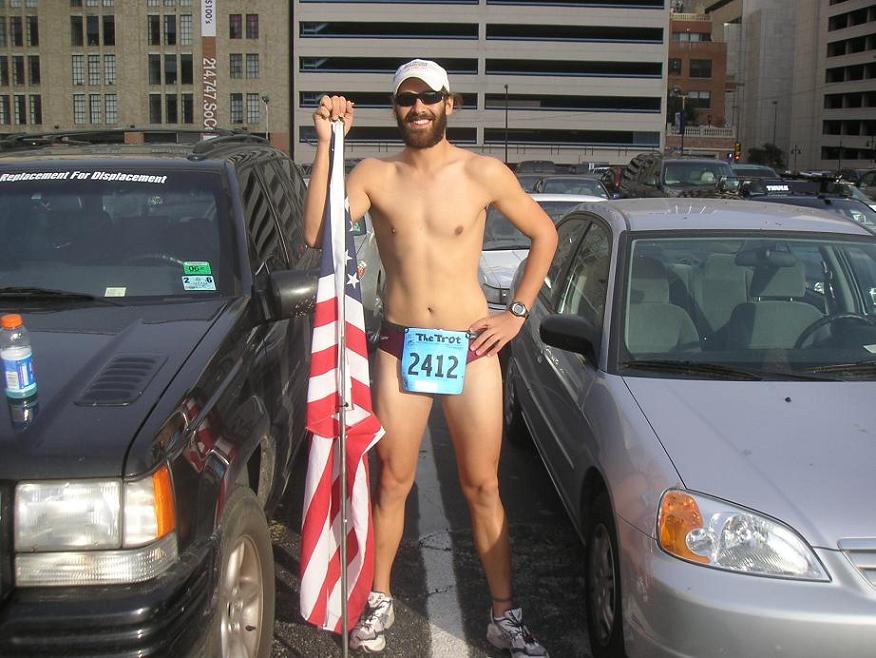 Finally I got a call from Mike(Turqy) and we met up at the start line. So Mike, his dad and I BS'ed for a bit while we waited for Brandt(OldAg92) to find us. However I still had to go back to my Jeep and change into my turkey costume so we had to leave our spot before Brandt was able to find us. I managed to wedge myself into my speedo and didn't even rip all the feathers off like I was afraid I would. Took a few pictures to prove my outrageousness and headed to the start line. The pack was already lined up and stayed near the back instead of pushing our way to the front.