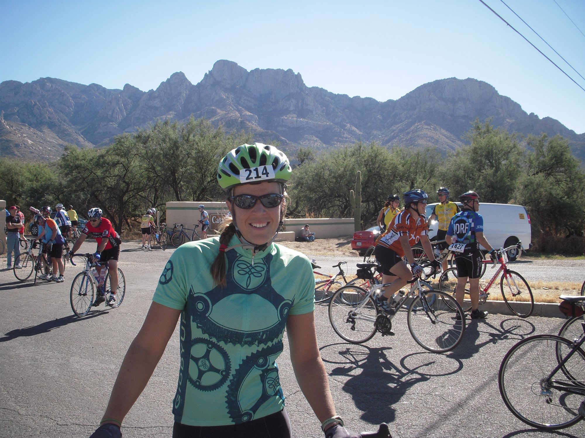 Comments: So, the race started right at 7am, and we surged ahead with the crowd of bikes. The first few miles were kind of surreal- there were SO many cyclists. And it was really chilly, as the sun hadn't really come up over the mountains yet. I went out going faster than I normally would because I was surrounded by so many fast people, but I was feeling great and just taking in the semi-surreal experience of being in the middle of such a massive event. Josh started off ahead of us and I assumed I might not see him again until the end of the race, but Megan and I stuck together for the first bit of the ride. About seven miles into the ride, the route crosses over a sandy wash where all cyclists have to dismount and carry their bikes to the other side. Of course, as soon as I picked up my bike to put it over my shoulder, I broke one of my water bottle cages. Luckily it didn't completely break off, but I realized that I'd have to be extra careful with my back bottle, since it was now pretty loosely attached. On the far side of the wash, there was a Mariachi band playing music and singing. They were really good, and this was also the first place on the course where lots of spectators were gathered to cheer, so the energy level was great. I stopped for a moment to see if I could find Megan behind me, but didn't see her and started riding again. To be honest, large chunks of this ride are kind of a blur in my mind. I guess that's what happens when you're on your bicycle for almost 8 straight hours. I stopped for the first time around mile 30 to eat a little bit and to blow my poor snotty nose (some super awesome volunteer actually grabbed a whole box of tissue from his car for me!), and then kept pedaling along. Meredith caught up to me somewhere along Houghton Rd, and we were able to chat a little bit up until Freeman Rd where I passed by her on the nice big downhill. I knew that there would be an aid station after the second wash crossing, so I decided not to stop again until that point. Around mile 40-45, I started to hurt. My legs were feeling heavy and my saddle was really starting to bother me, and I was beginning to worry a bit about how I'd finish another 70 miles. I kept plugging away, forcing myself to drink and eat even though I wasn't hungry at all, and eventually made it to the second wash crossing at mile 47. Just as I was starting the second wash crossing (which was really long, like 3/4 of a mile), I got a text from Josh saying that he was also at the wash. I was able to call him and figure out that he had just finished walking through the wash, and he waited for me on the other side. I was really pleased to know that I had been so close behind him, and it was also nice to stop for a minute and talk. I think walking across the wash gave my legs just the break they needed, because I felt much better after trudging through all that sand, surprisingly enough. Within the first mile after the wash, there is a purely awful hill on Snyder Rd. I made it to the top and pushed through, but man, this killed my legs. I was happy to coast down a few hills after that. I lost Josh again soon after the Snyder Rd hill, and tried to keep thinking about how nice it would be once I had finished all of the uphills along Sunrise and Oracle and could finally enjoy the awesome downhill on Tangerine. I was doing fine, pedaling and spinning my legs as fast as I could, but I always seemed to be all by myself on the road, with big packs of people behind me and in front of me, but never with me. Oh well. Probably for the best, as big packs kind of freak me out anyway. I passed by all of the aid stations because I felt like I had plenty of water and I had eaten a good bit at the wash, but this turned out to be a bad idea. After the turn onto Oracle, I soon realized that I only had a couple more sips of water in my bottles. I definitely should have refilled them back at the Snyder wash. Oracle Rd is a bitch no matter what, but this was especially rough for me. I was riding all by myself (or felt like it, anyway), the wind was starting to really pick up, I was concerned about saving my last bit of water, and I didn't know when the next aid station was. I had a horrible feeling that I wouldn't be able to get more water until after the last steep hill on Oracle, which was going to suck. Justin caught me about halfway up Oracle, and chatting briefly with him was enough to temporarily take my mind off of the dreaded upcoming hill, which was good. He passed me after a short while, and I was back on my own. Just as I was starting to see the hill nearing me, I noticed an aid station on the side of the road- I was so happy to see that damn aid station. I pulled off and dropped my bike, and as I walked to refill my bottles, ran into Josh again. We talked about the wind and the hills and ate a bunch of fruit, and he reminded me to take some Advil, which I'm convinced was a lifesaver. From this point on, Josh and I remained pretty close and leaped back and forth with each other for the rest of the race. This water stop was JUST what I needed, because I totally got a second wind after leaving. We tackled the Oracle hill, then the rolling hills in Rancho Vistoso, and then we were off to the lovely 5-mile downhill at Tangerine Rd. The wind had picked up considerably as we rode through Rancho Vistoso, and we were all beginning to dread the final 15 miles of the race, which we knew would be directly into a headwind. I had not been expecting the crazy crosswinds on Tangerine though. On a normal day, I can coast down Tangerine at approximately 27mph, but on this day, I had to pedal pretty hard to keep up a pace of about 24mph. Talk about frustrating! This was not the free speed I had been looking forward to at all. Feeling dejected, we stopped at the bottom of the hill to stretch and eat a bit. I was feeling surprisingly good, and at this same time I looked at my watch and realized that I could most likely beat 8 hours for th