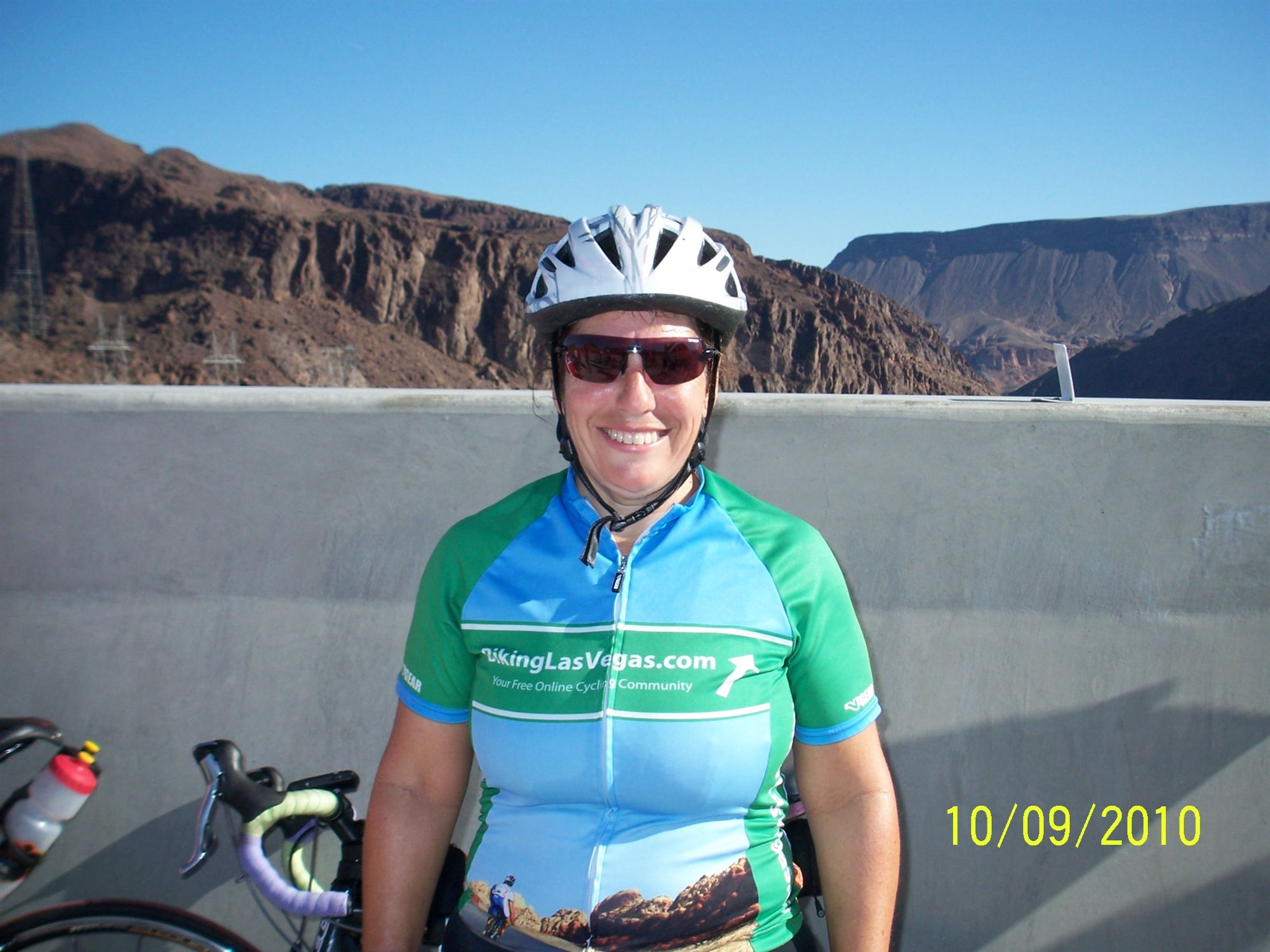 Comments: The starting shoot was LONG, and they had the music playing "Viva Las Vegas" with Elvis and show girls - only thing missing was Oscar... a brief count down, the horn, and we were off Down the streets of Vegas we went - with Police Escort so we didn't have to stop at any traffic signals - how cool is that? soon enough, we were at the first big hill (of many) My strategy was just to put it in an easy gear and spin... success... made it up to the top and was rewarded with about 6-8 miles down hill... We came to the first Aid Station and it was a mess! Bikes all over the place, lines about 20 deep for the port-a-pots...I had to go, but I could wait... so I navigated around the crowd and rode on... up the road a ways, there was a turn-out and a car was stopped with a man setting up some equipment (looked like a tri-pod) I stopped there to eat my first PB&J sandwhich (Nutrition plan was to stop & eat half a sandwich every 20 miles and to munch on pretzels & sports beans in between, plus NUUN tablets in my water bottles)... turns out it was the Bike Mechanic from REI - he took a look at my brakes for me (they had been making noise) and gave me a cold bottled water - PERFECT! After about a 5 minute break, I rode on... my TnT friends were long gone by then... What goes down must go back up, and the climbing started again... I stopped and took a picture of Lake Las Vegas - it was a beautiful view on a beautiful day...and I hardly ever have my camera while riding out there... I climbed up out of Northshore Drive and onto LakeShore drive... got up the "hill from hell" and I knew there was a restroom soon, but when I passed, there was a line - Boulder Beach it was - whether there was a line or not... At Boulder Beach, I stopped at the restroom - nobody else was there - at first I thought maybe the door was locked, but nope, I got to go with NO WAITING - SCORE!!! I got back on the road, and started the steep climb up past the visitor center to the main road, turned left and headed to the Dam... There was another Aid Station there, and I quickly filled my bottle with water, then continued - past the check-point and onto the Brand New Road... it was smooth and since it wasn't open to cars, we had the whole road to ourselves! Soon, I was on the Bridge - the only way to tell was that the Volunteers were there with Cow Bells and cheering us on... You really couldn't see anything because the walls were too high... but they had a Camera Set-up to take your picture with the Dam behind you... as I rode up, the whole BLV group had just taken their group shot - I was told I was about 2-3 minutes late for that... but the Volunteers let me cut in line for an individual picture so I could be with my group... I had my picture taken, and the group rode off... I stayed there for a bit... I looked over the wall at the Dam, but because I'm so short, it was hard to see anything... I don't know if we rode into Arizona, but when I was coming off the Bridge, there was a "Welcome to Nevada" sign, so I stopped to take a picture of that too... Now that the exciting part of the ride was over, it was hard to get motivated for the next 75 miles - especially as now the hard climb to Boulder City was about to start. Since that was an out-and-back section, I got to see that there were TONS of people ahead of me, but that there were also a lot of people behind me... I stopped half-way up the hill to Boulder City to eat my 2nd PB&J sandwhich... a little late at around 45 miles... it's all good... finished my climb and got on the River Mountain Trail - the volunteers were AWESOME again, making sure we went the right way and warning us of the hazards. I've gotta say that this course was VERY well marked, I never questioned which way to go, never had to take out my map! The RMT was a fun part of the ride - mostly down-hill but a few short steep uphill parts... We turned off the RMT onto this street where I had never been before - I'm thinking it's where the Silverman Route goes that I missed with Jen when I rode with her last week.... It seemed to take forever, but at around mile 60 was the turn-off for lunch... I debated going down the hill to the park, but I needed more water, and I could use the break... when I got there, there was a LONG line for food/water.... but I waited in line, refilled both of my bottles, and ate the turkey wrap and a pickle... then got back on the road... when I tasted the water, it tasted HORRIBLE... the first place I could, I stopped and bought some bottled water and continued my ride.. I'm thinking I would have been better off eating my PB&J and getting water at the store - which I did anyway... I think I could have cut off about half an hour to 45 minutes off my time... about 5 more miles, there was another aid station, but I didn't need to stop... The roads were GREAT going through Henderson & Southern Highlands, and I hated that we went up Jones to get to Blue Diamond Highway - I had driven down it once looking for a bike route and decided it wasn't good - no shoulder, no bike lanes, and heavy traffic... But it was the course, so I went up that street... my left foot was REALLY hurting - not sure why... But I unclipped it so I could move it around hoping that would help the pain... as I was trying to clip back in, I looked down to the left, and I swerved to the right and went off the road - there was about a 4" dip from the road into the dirt, and I fell road side... I was VERY lucky that the car that was behind me stopped before I got run-over (that's always been my biggest fear)... she got out of her car to check on me... nice lady! There were also some other cyclists that stopped to assist... I lost about half of my Sports Beans & pretzels in the fall.... and when the cyclist turned my bike over to put the chain back on, I lost the rest of my afternoon snacks... oh well... so, now my hip and back were hurting, my adrenalin was high, and my pride hurt, but I didn't feel the pain in my left fo