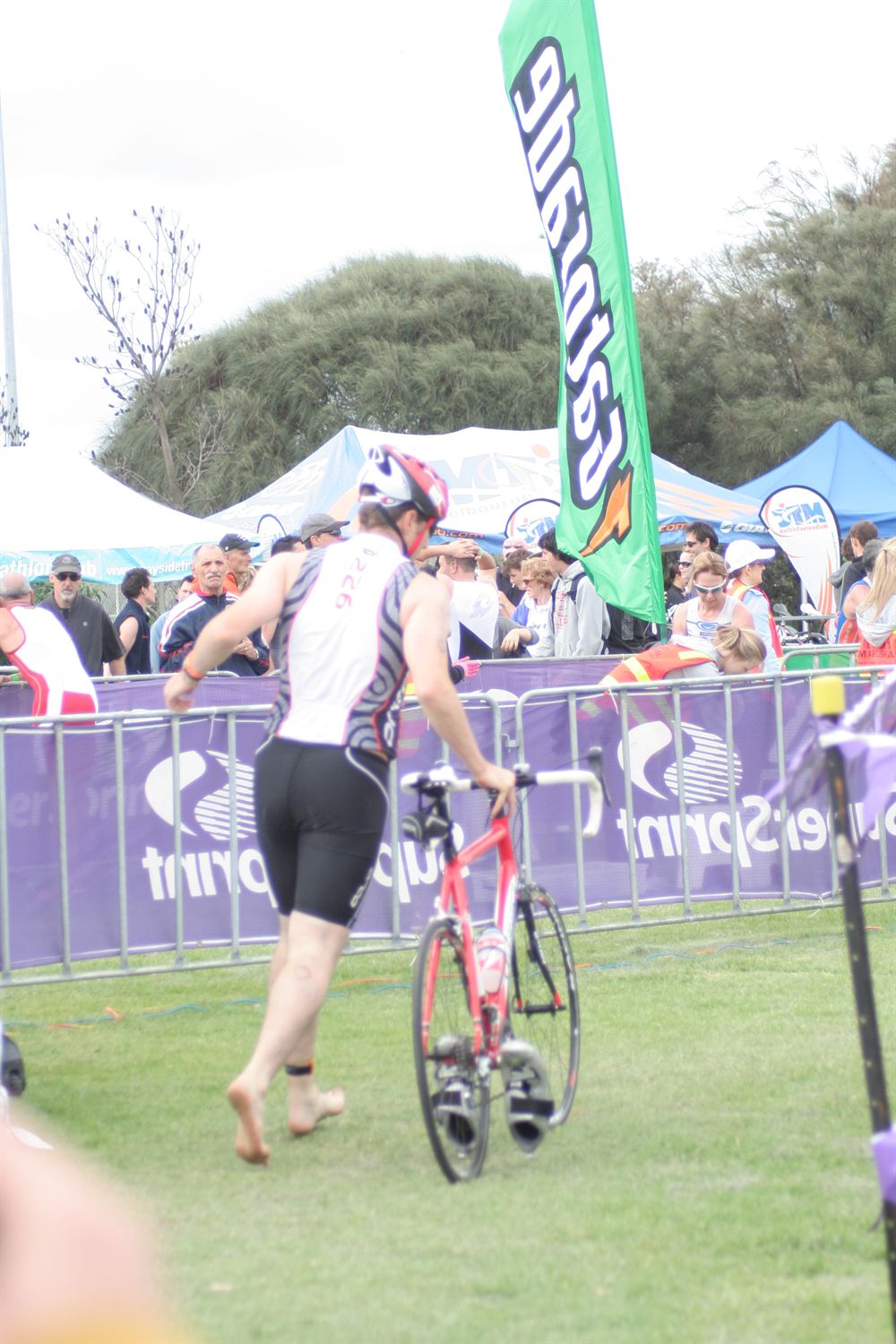 Up at around 5am and I had my normal breakfast of a banana & strawberry smoothy with toast and at 5:30, Lori and I headed off. We arrived in Elwood at around 6:45am and I racked my bike and was all ready with PLENTY of time. I then realised that my start wave was 44 mins after the first wave so had even more time. Spent the 1 1/2 hour wait just walking around and watching the swimmers from the Active Feet struggle through the choppy conditions.