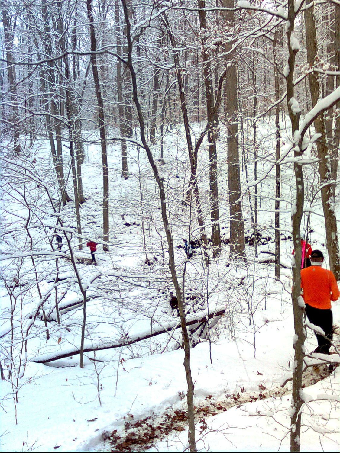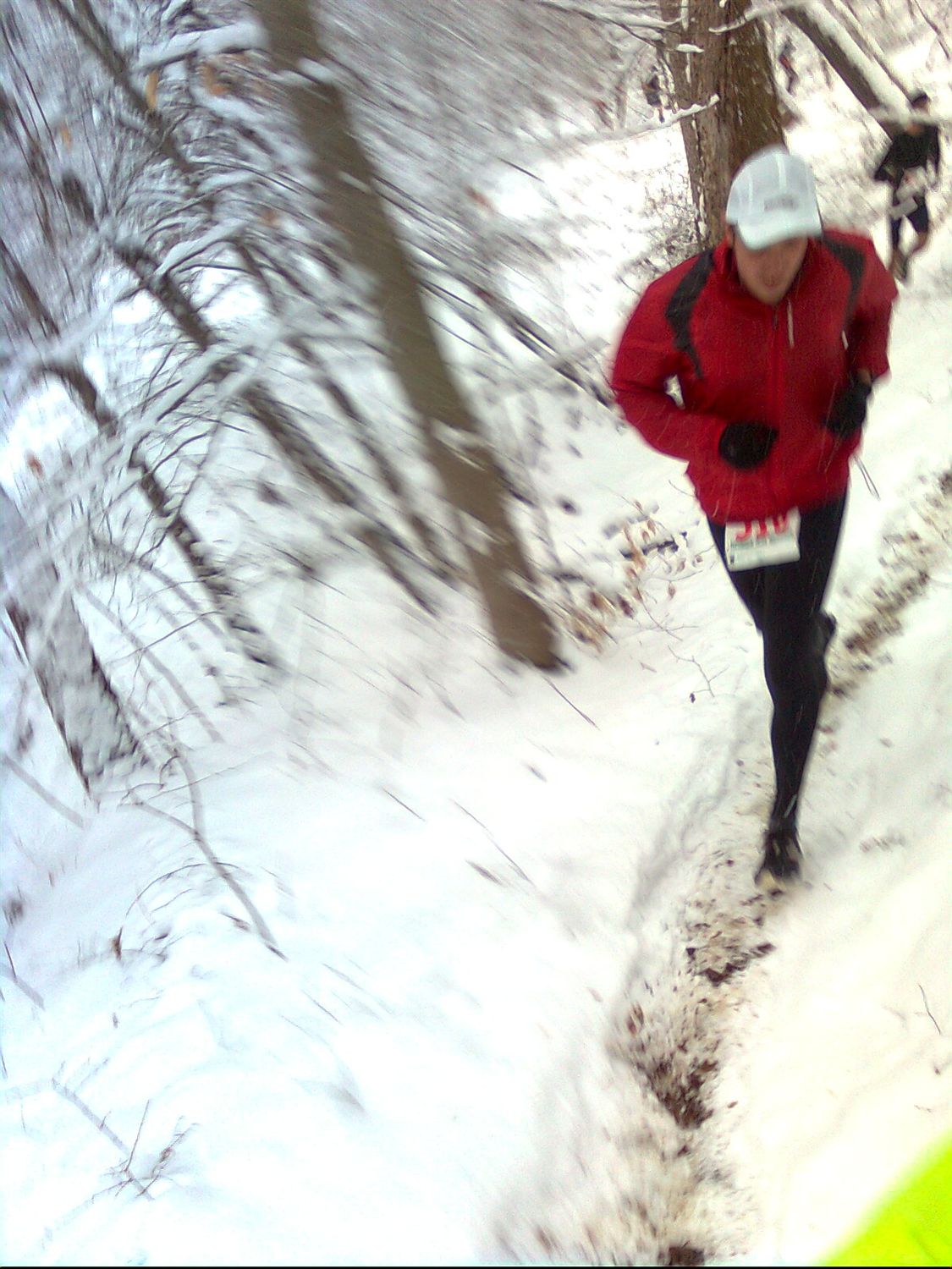 My plan was to run at a relaxed pace, walk the hills, stop to eat and drink at all the aid stations, and make it through the race without bonking. No time goal. Given the forecast, I had gone out and gotten some YakTrax the day before, and boy am I glad I did! I felt like Spiderman (or maybe a yak), running without slipping on even the most slippery downhills and stream banks.