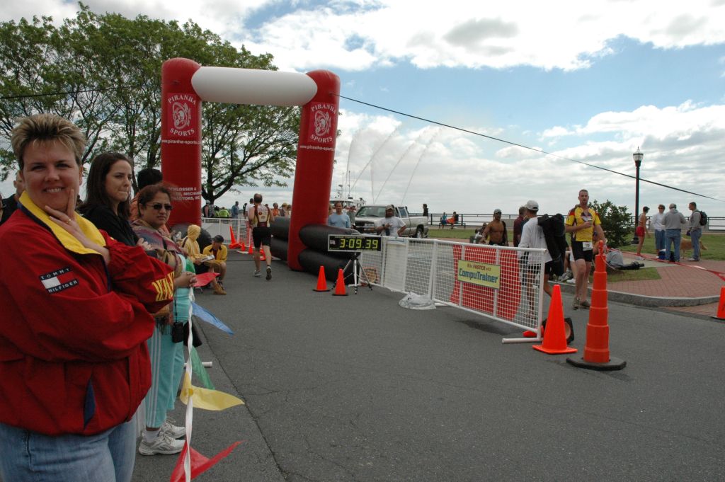 Comments: 4TH in my AG!!! I can't believe that! On the downside, I may have pushed too hard on the bike and paid for it on the run, but thats for later. I kept a solid cadence and passed several people right out of the gate. I had fallen behind in the swim and now was the time to make up for it. The practice for and race at Columbia prepared me well for how to handle climbing and descending. I geared down for a high cadence and passed some people who were hammering up in too high of a gear. I was able to keep a minimum speed of 14mph going up, and got up to 37mph on the descent. Everything else on the course was pretty much flat, but I stayed in the aero bars, kept a high cadence and simply kept passing people. After the 1/2 way point, I started to feel like maybe I was going out too hard and my back started to cramp up. My mind turned away from the pain as the wind became my foremost nemesis. On the 2nd climb over the bridge, the winds were gusting pretty fierce by this time. I struggled through to maintain an 8mph climb and then really got a feeling for the winds when I maxed out at 18mph on the downhill while I was PUSHING! One of the best feelings of the day was that I was not pulling up the rear of the course. Because I went out with my age group, it meant that there were others going after me. It gave me the feeling, for once, that I was not last on the course and that there would still be things going on when I came in at the finish. When I came in, I realized that I didn't drink enough on the bike. There was still 1/3 of the gatorade left in my bottle. What would you do differently?: Nothing I can do about the wind. Strengthen the back. Drink more. ![]() Transition 2