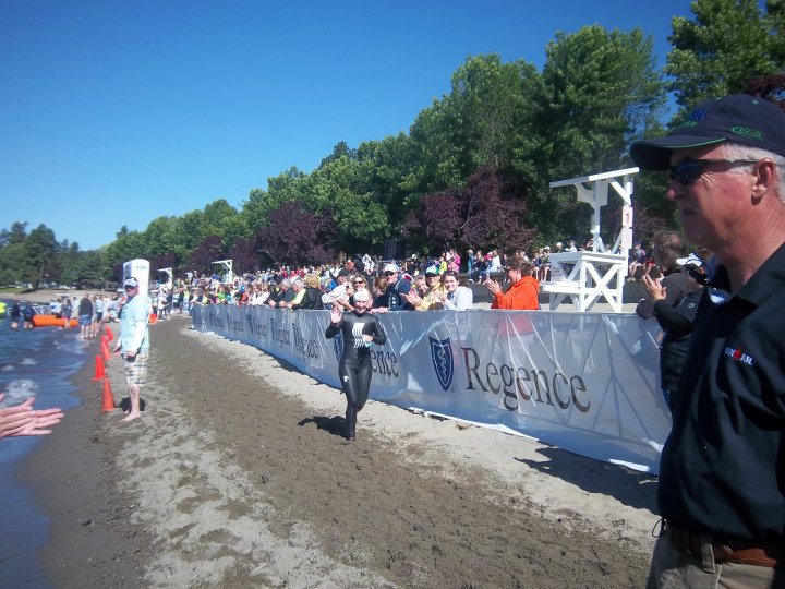 Comments: The water was cold and choppy the day before. I saw someone with booties, heard that he had bought them nearby, and went and grabbed myself a pair. Glad I did, two hours is a long time to be in the cold water. Went for a quick dip and headed to the back near the buoys. Waited for everyone to get in the water (about 30 seconds) and headed out. Water was better than Saturday but still choppy and I had trouble from the start. Connecting leg which is parallel to the current and near the boats was the worst, swam side stroke there. Conditions were worse the second time around. From what I've heard these were relatively good conditions for CDA, but I struggled. What would you do differently?: I should spend more time open water swimming, especially beach entries, but I hate it so much I doubt I ever will invest the time. I'll just keep hoping for calm waters. ![]() Transition 1