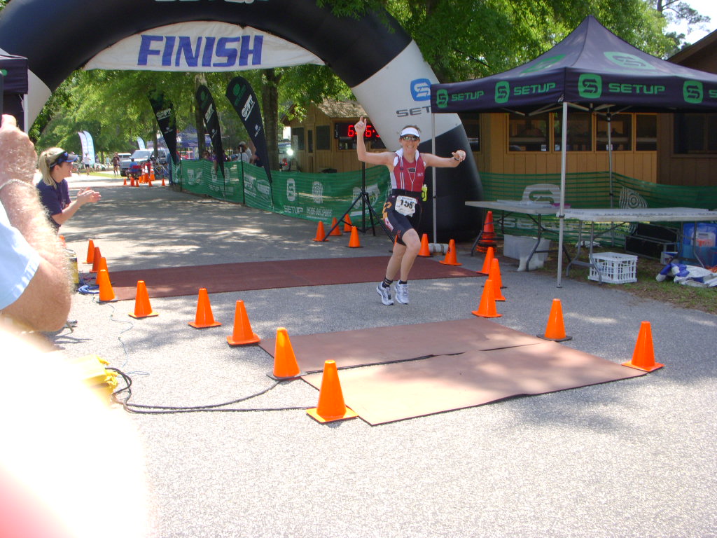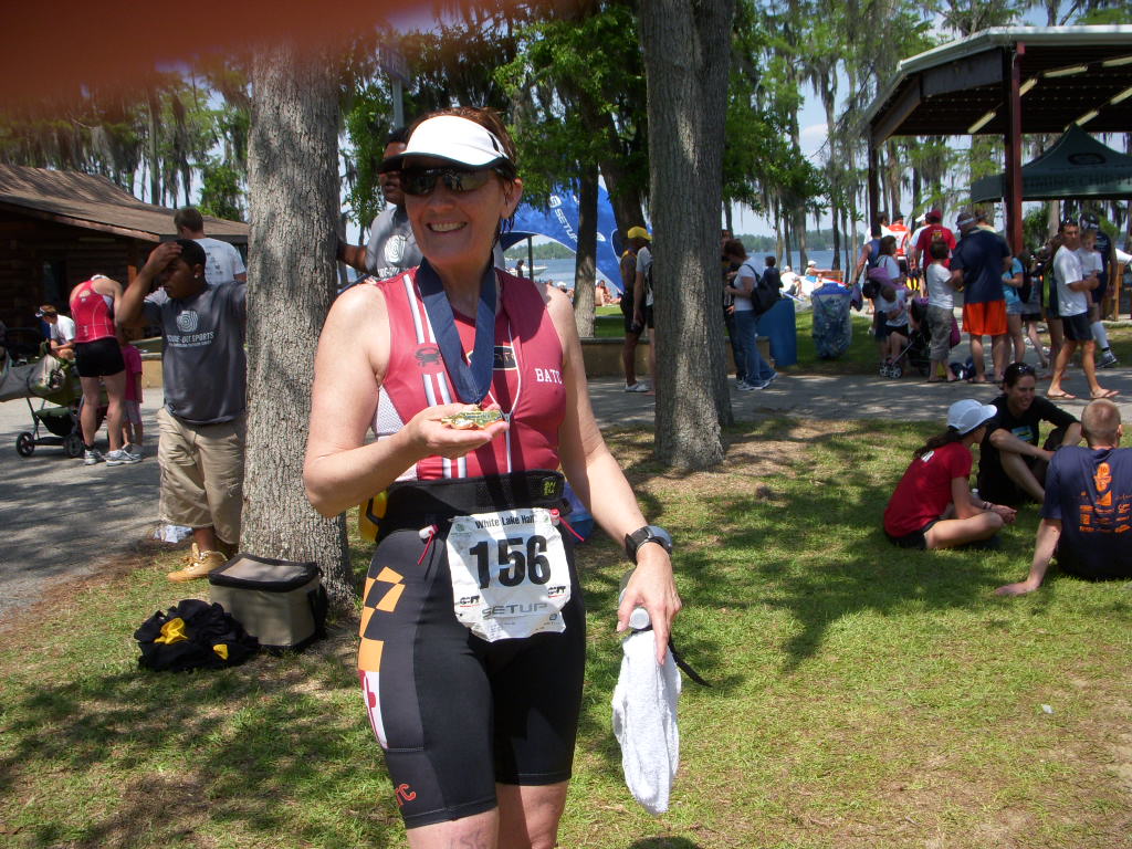 Warm down: drink some water! get pictures with medal. knew I needed to eat, found sun chips, but I have a really hard time getting anything down my throat after a race - - liquids are okay, but solid food is just too rough and doesn't want to go down. I sat around and waited until they started the awards (wow! I made it back before they started the awards - that's a first!). What limited your ability to perform faster: wanting to play it conservatively, since this was my first half iron and I didn't want it to over do and regret it. I'm perfectly happy with my performance and wouldn't have changed it at all - just lessons learned for my next one :) Event comments: It's a real shame the swim was cancelled, but visibility was pretty awful (and admittedly had me more than a little concerned). This is a GREAT race for a first timer. Low key, beautiful lake (I swam in it the day prior and it is truly lovely, sandy bottom, clear, flat as sheet of glass), run around the lake is fun, lots of cheering from road side. Weather was cooler than expected - if it had been hotter, it would be very different - there is no shade. I had prepared for heat by adding layers of clothing to my training runs and rides (which is why I may have been cold on the bike and glad to have that extra layer). Super Race! Just a note - the shirts are unisex sizing (which I don't remember reading at registration) and I'm a pint size - - so I was swimming in the small that I had ordered. The set up folks were great about letting me exchange for an extra-small after the race. Last updated: 2011-01-02 12:00 AM