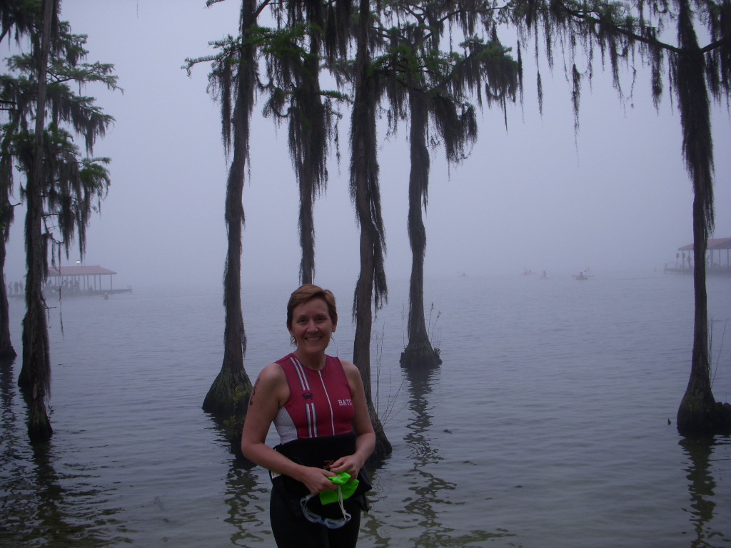 ready and waiting to go in water for warm up - swim is cancelled - heavy fog - couldn't see the first buoy from the end of the dock. becomes a bike/run. change out of wetsuit and into bike gear - wait some more to be corralled in 9th wave (last, again).