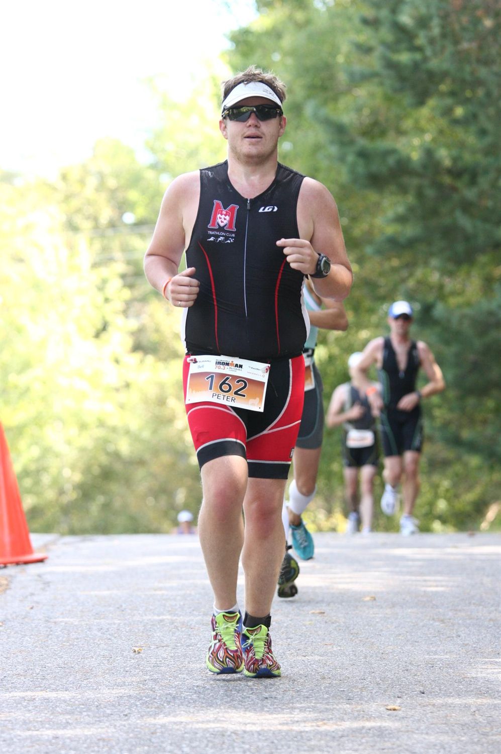 Comments: So coming out of T1, less than 20m into the bike, I realize that I'd forgotten my watch in T1. Great. I guess I'm going at this one completely blind. Road can use some maintenance.. Immediately on the bike, bad things started happening. Mount: Miss my cleat and land seat first on the saddle. OUCH, still hurting now (on Wednesday...). I start going, and something feels off. I don't know what it is. I try to drink some water, but that doesn't help. Thinking about starting my hap-hazard nutrition plan early, but with the hills, it's just not feasible. Oh well, push through, right? Out to 60/35 felt alright. Things started to get better. Nutrition started happening, started spinning well, everything was getting better. Had a few conversations with other riders as they passed, or I did. Tried to gauge my speed/time based on asking others what time it was. Yo-yoed back and forth with a few people, Connor and Michelle are the only ones I remember. Connor was not having a good time, not having trained hills. Poor kid. Around the 60k mark, I got a little bit lightheaded, which hasn't happened before. I realize that I'd only taken in about 400cal on the whole ride so far, so I took a gel that I wasn't planning on taking, but just decided to throw into my pocket last minute. That probably saved my ride. A few km after the lightheadedness, cramps started coming. Quads and hip flexors were not happy with me, and the uphills really hammered them. I took it easy, trying to fend off the cramps. It seemed to work pretty well. Uphills sucked, downhills and flats were ok. No major problems. Only time I wasn't having a good time was on the last major climb. Very seriously considered walking, but stuck to it and pushed all the way up. Last 2k was a fast, fun downhill, allowing me to stretch out my legs, try to get rid of the lactic acid, and just enjoy coming into T2. What would you do differently?: Hard to say here. I felt pretty good throughout, despite a few minor hiccups. The course felt harder than it did either time I was out riding it in training. I think I would pay more attention to nutrition, and stick to a plan. Other than that, I felt pretty good out there. Obviously, a different race setup might help, with wheels and an aero helmet, but whatever. Overall, I am fairly happy with the ride. I came in right where I thought I would, just over 3 hours for the 94k. ![]() Transition 2