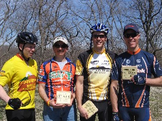 Comments: I had the race locked up in points before it started so our total objective was to get Brent or Mark on the podium. We had a good strategy planned with a block set on the 2nd lap and then a break with me Brent and Mark, and I would do the lion’s share of the pulling. The team did perfect on the block and Brent and I were able to break out and go, but Mark could not hang and Brent’s legs gave out after about 3/4 of a lap and they were able to bridge. We went back into the pack and regrouped. I told Brent to stay there as I was going to attack then not go anywhere and make them chase me, which they did two times. At the bell lap we were looking OK for the sprint. I took Brent on a lead out but he could not accelerate and the Velo Tek threat passed, I had to leave Brent and take his wheel to minimize his points. At the print line I took first and Brent and the next threat were dukeing it out for 3/4, Brent got 4th.....(this will haunt us). We waited for the pack and got Brent rested, 2 more laps no issues. On the last lap we were positioned perfect and before the S turns I attacked with Brent, had to check up slightly to keep him on the wheel and then the Velo Tek dude bridged us and passed on the right. I was yelling at Brent to hold on a dig deep as we took Booths wheel, he checked up as the pelton was closing, left turn we were 3 abreast, I was squeezing him out on the right when he got behind me and on Brent’s wheel and then his left side. I jumped up hard and got in front of Brent and made it over to the left and started to block him out, he lost some speed and I was yelling at Brent to go when he squeezed around on the left where the was a very gradual left turn, missed that. Then the next threat was on the right and was able to block him some also. Brent came across in 3rd and Larry was 5th (next threat). This left Larry 1 point ahead of Brent and therefore missed getting Brent on the podium. It was a wicked fun race and I later found out that Brent missed the sprint point by about the width of the tire......uuuggghhh so close. What would you do differently?: Maybe a little more aggressive on the block but first real try at making that happen, was fun with the strategy. ![]() Post race