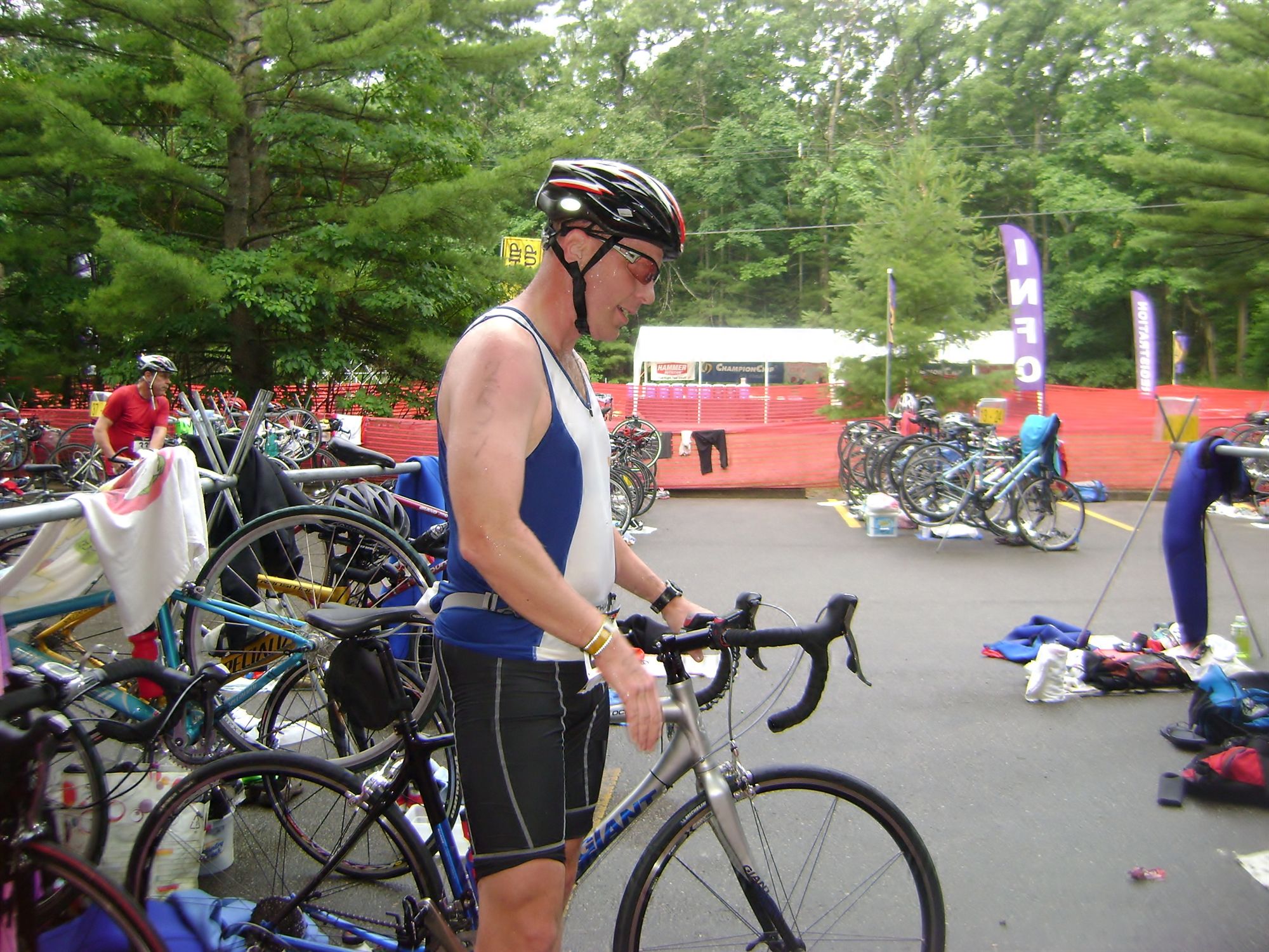 Comments: This course was fun for me. I quickly got up to speed and worked on keeping my cadence high. My bike fitting and pedal setup seems to be working, as I had very little twinges from my knees. I felt strong and fast on the bike almost the entire way. Some wind gusts after the turn around point slowed me down, but not by a whole lot. I pushed hard after the turn around and passed many people, once again including several fancy Cervelo and Felt tri-bike riding folks. What would you do differently?: I'm not sure yet. I enjoyed the ride and felt good, but I am wondering if I pushed too hard and it affected my run. Definately will NOT eat a Cliff bar on a race again. I managed to only get half down, and it stayed like a lump of concrete in my stomach the rest of the day. ![]() Transition 2