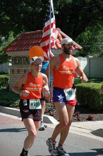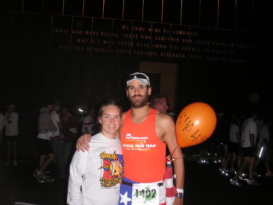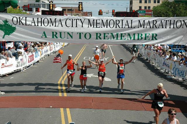 Warm down: Haley was waiting for us at the finish (she had my VIP wristband) and took a group photo for us. We all exchanged emails before we went on our seperate ways. I got my finisher medal and grabbed a handfull of cookies, some yogurt and a couple of burgers from the post-race food tables. Sat down near the finisher shirt tent and ate for a bit. After a few minutes I went back to find some ice for my ankle. Oddly enough my right ankle hurt during my races yesterday but my left ankle was the one that hurt today. Strange. I took off my shoe and filled my sock with ice before I walked back to finish eating with Haley. I told her all the stories from the and our routine of jokes (Two flies are sitting on a wall. One fly looks over at the other fly and says, "Your man is open.") before I grabbed my finisher shirt. We sat under a tree in a small field before we walked back to the parking garage. I stretched out a bit before we got in and headed back to the Metroplex. What limited your ability to perform faster: It was my job to run 4:40. Event comments: The OKC Memorial Marathon is a great race and the city really gets into it. I did the half last year and really liked the course but wasn't planning on doing it this year. IMAZ was just 3 weeks ago so I didn't know if I'd be able to do a marathon this soon, but I was asked to be a pacer and they paid my entry fee. Plus I got to cross another state off my list. How could I turn that down?!? Last updated: 2006-04-12 12:00 AM