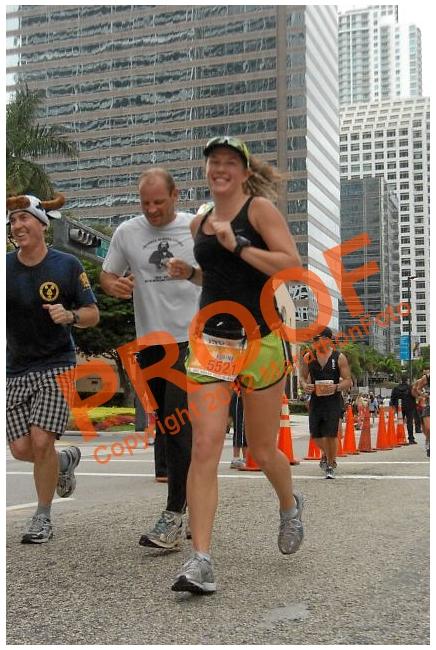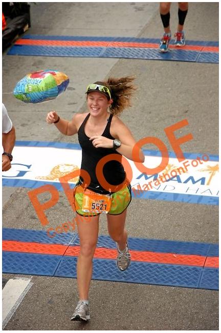 Comments: Wow. Where do I start? I was smiling for almost the whole thing! We crossed the start line, and I was moving at about 10:20min/mile, and so was everyone else. I was so happy I ran into Rosa before the start, and we ran together for a few miles. I carried a water bottle, because I was told that the first aid stations were a total cluster. Glad I did! I chucked the water bottle after the second station and started relying on the course. I lost Rosa around mile 3, and I was on my own. I chatted with a few people, was blatantly ignored by others... Just as we entered South Beach, the 4:15 pace group passed me. I had no idea they were behind me! Around this time, I also changed the screen on my Timex. I had set the distance to 26.8, and the time to 4:30. The screen just had big #s, telling me how many minutes & seconds I was behind my goal time. I was probably around 4-5 minutes at this point. South Beach was cool. I hit the 5 mile sign and thought to myself that I could do that 4 more times... and then still run 1.2. They had these 8oz bags of water they were handing out, which were the best thing EVER. (http://www.82gowater.com/site/). Somewhere on SoBe I also stepped on a mostly full one of those that squirted directly up my shorts. For a split second, I thought I peed. We ran past a good amount of spectators, some still out drinking from the night before, some just waking up to cheer us on! I picked up another running buddy around mile 7, and we chatted for about a mile. She told me to take the sidewalks over the bridges on the Venetian Causeway, because the metal grates were tricky. Shortly after I left her, I picked up another girl who works for lululemon. They had INSANE cheering sections at two different points on the marathon course, and she took off when an entire entourage ran about 1/4 mile with her. Along the bridges, there were even people cheering from boats! I thought that was totally cool. The final bridge brought us back into the ING Cheering section. It was just after mile 10 - and I let the thought enter my head that I still had SIXTEEN miles to go! I quickly pushed that out of my head and decided I couldn't count down miles until I had less than 10 left. Until then, I'd count up! The cheering zone was crowded but not very loud. The highlight was definitely the guy in the middle of the course with a "Free Hugs" sign. I gave him a BIG hug, then continued on to the crappy part of Miami. The miles stopped flying by from 11-13. I was anxious to reach the Half/Full split. I eventually made it to the halfway point, crossed the mat in 2:13, and found my friend, Wally! I personally do not bandit races. I think those that do are making their own decision. Wally wanted to bandit the half, but when he found out I was running the full, he asked to run the second half with me. I accepted. He's ran the half at this event more than once, and really wanted to do the second half of the course. So I picked up Wally, who had a Happy Birthday balloon tied to his shirt so I could find him. The balloon was meant for a friend whose birthday was the next day. But, it was Wally's birthday earlier in the week. He was confused when people started wishing him a happy birthday because he forgot he had a balloon tied to his shirt! I briefed Wally on my pace, progress, plans and whatever I thought he should know. We settled into a comfortable pace and kept going. Shortly after mile 15, we came upon the hashers! Patrick met me on my side of the road and gave me a little cup of beer. I drank it, and I was off again! My plan was to eat every 5 miles. I ate at 5, 11 (didn't see the mile 10 aid station in time!), and at 15, I really didn't want another gel. So, I waited. Mile 16 came and went, and I still didn't want to. I knew I would be starting to cross that bonk line, so at 17, I forced one down. Luckily, it stayed down, and my stomach didn't revolt. I hit mile 18, and I was confident that I had 8 more miles in me. Around this time, I looked at my watch, and it said --:--:--. I was right on par with a 4:30 finish (for 26.8 miles though). My GPS had me about .2 miles further than the course at this point, too. At mile 19, we were FINALLY headed back in the direction of the finish line. I was still happy feeling good. I could have stopped at a port-a-potty, but I didn't want to. I was afriad it would be hard to get moving again. My stomach gave a few threatening grumbles for the last 7 miles, but thankfully, nothing awful happened. We hit mile 20, and I saw my first runner in distress - sitting on the side of the road with medics attending to him. I was happy I still felt ok, but it was a reminder that things could shift at any time. With a 10k left, gas still in the tank, I expected the miles to start flying by again. They didn't. I kept breathing steadily, taking in gatorade and water at the aid stations, and pushing to mile 21.5 where I knew I'd see my hashers again. I grabbed a beer, a kiss and some high-fives and kept moving. To my surprise, two MORE hashers were running with me! Stop the Bus and Wimp! (Those are their hash names, get used to it!) They caught up, told stories, and just distracted me from running. At mile 22, we split and head towards the Rickenbacker Causeway - the tallest bridge in South Florida. Wally complained, but I told him we'd just turn around under the bridge, and not cross over it. As we ran through the toll booth, I joked about not having change. Stop the Bus was happy to see I still had my sense of humor, but that was about to disappear. Mile 23 brought pain. I was still moving, still picking off people left and right, but dang did it start to hurt! Right before mile 24, I ran into yet another hasher! He was running the full and was struggling. We ran with him for about a mile before he dropped back. I hit mile 24 and started pushing with whatever I had left, which wasn't much. The finish line did not want to get closer. The last two miles felt like four! Wimp st