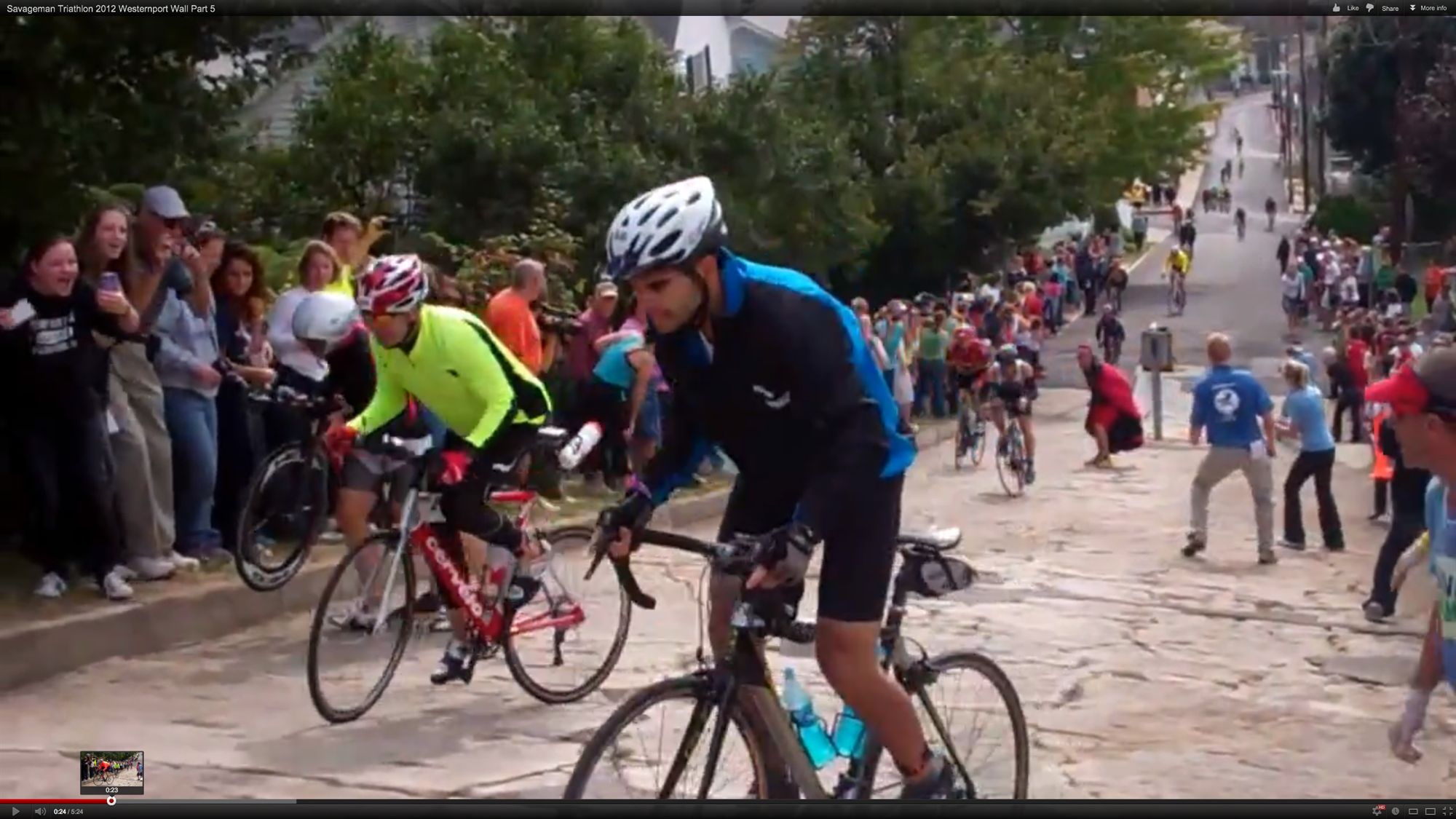 Comments: Summary of Bike Course here: http://savagemantri.org/Bike_Course.html Full course profile at http://savagemantri.org/Images/Bike_Half_profile.png(see photo below) One word: Savage. Actually, another word: Epic. This is the most incredible bike course I have ever ridden in my life. Your emotions run the whole spectrum: it's the most brutal, the most beautiful, and the most rewarding, with the most amazing support from the spectators and volunteers. The first sign of things to come is Toothpick Rd., just after transition. Then you get some nice rolling hills in the sun before the LONG AND COLD DESCENT down Spring Lick Rd. At the bottom the ride along Savage River is really beautiful. Once you cross the bridge on the approach to Westernport, you can feel the anticipation as you pass the paper mill. Once you make the turn into Westernport, you are immediately greeted with ... HILLS. BIG Hills, averaging 12%-15% grade over 4 blocks BEFORE you hit the Wall. For a taste of the number of bikers falling at Westernport Wall, go to http://www.youtube.com/watch?feature=player_embedded&v=EcqIgCJNjto I took it REALLY easy by switching to my easiest gear (34/34) and doing the paper-boy switchback all the way up: it was really easy, and others started passing me, but I just wanted to save my legs for the Wall. I was already getting fired up, the fans were already lined along the streets 3-4 blocks before the wall, and I saw a wonderful message in chalk from my family. Words cannot describe the insanity at the Westernport Wall: the blasting of "ROCKY" music, all the cowbells, the cheering, the screaming, and your brain is telling you, THIS IS IT! It was like an out-of-body experience where everything starts moving in slow motion, it is that emotionally intense. The strategy almost worked: I felt strong coming up to the Wall, and I actually made it almost to the top, except at the last moment I had to veer left around a fallen rider -- I saw a huge crack in the road and knew I had to power through it. I got over the crack with the front tire, but the back tire of my tri bike did a wicked jump on the crack that unclipped my right shoe from my pedal causing me to fall sideways. Here's the YouTube video of my attempt: I'm in the bright yellow w/ leg warmers and red gloves in the first 35 seconds of the video. http://www.youtube.com/watch?v=veUVx9w09uU Talk about a range of emotions within 10-15 seconds: determination, out-of-body experience from being overwhelmed by the screaming/cheering/cowbells/Rocky Music, the thrill of knowing you're about to make it, making a quick adjustment around a rider, surprise and shock when your pedal unclips, disoriented when you're on the ground with a volunteer saying "I have your bike, get to the side and get your bike at the top". I'm not disappointed, it was just bad luck getting unclipped. As the race director Kyle Yost says, the spirit of the Wall is that it's not just about being "able" to make it up the Westernport Wall, it's also about having the right line, and a little bit of luck. After stripping off the cold-weather gear 100 yds. after the Wall, THE REAL HILLS BEGIN. Total. Sufferfest. It felt like I'd be out there all day, but the signs by volunteers were hilarious and the scenery beautiful. The best view was at the top of Otto Lane, looking over my left shoulder, and seeing the wide expanse of mountain ranges. I took my time up Killer Miller, and did OK: the TWO cheering squad parties were amazing, and a real boost. After Killer Miller, I started to feel pretty good about myself, only to be slapped silly by Maynardier Ridge (DAMN you, Kyle!). Once I hit the open corn fields, I had a big grin because I knew the end was in sight. What would you do differently?: Note to self: SELF, do NOT eat garlic bread before a race: the, er, "pains" the next day on the bike are not pretty. ![]() Transition 2
