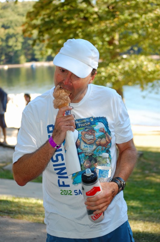 Warm down: Walk around and work out the finish-line cramp in my hamstring, wolf down a peanut-butter-chocolate ice cream cone. MMMmmmmmm. What limited your ability to perform faster: Seriously??? Savageman??? Event comments: There are some things that change you: this race is one of those things. Training for this race was hard: it was hard on me, it was hard on my family. The training over the last two years was the toughest I have ever experienced. If I doubted whether all the training for some race was worth it, those doubts were swept away upon realizing that my suffering was nothing compared to those who suffer from cancer and other immunodeficiency-related diseases: people I know and for whom I care. To say I was encouraged by my families and donors the last two weeks before the race was an understatement: they lifted me up from my mentally exhausted state at the end of my training to remind me that yes, this was something worthwhile. I would not have been able to cross the finish line of "the toughest triathlon in the world" without the support and prayers of my family, friends, and of course my generous donors who helped me raise money for Joanna M Nicolay Melanoma Foundation, in the hopes that my suffering may help others. I learned to counter every moment of suffering or doubt with a renewed determination to get the job done. I thank God that I was able to glorify His name by finishing this race in the name of all my generous donors, my friends and my dear family. I hope anyone reading this will remember that if you have the will, dedication, and resources, you'll be amazed at what you can accomplish. More Pics here http://tri-to-win-events.smugmug.com/keyword/y12-268-tp-rsm#!i=2109... Last updated: 2012-01-03 12:00 AM