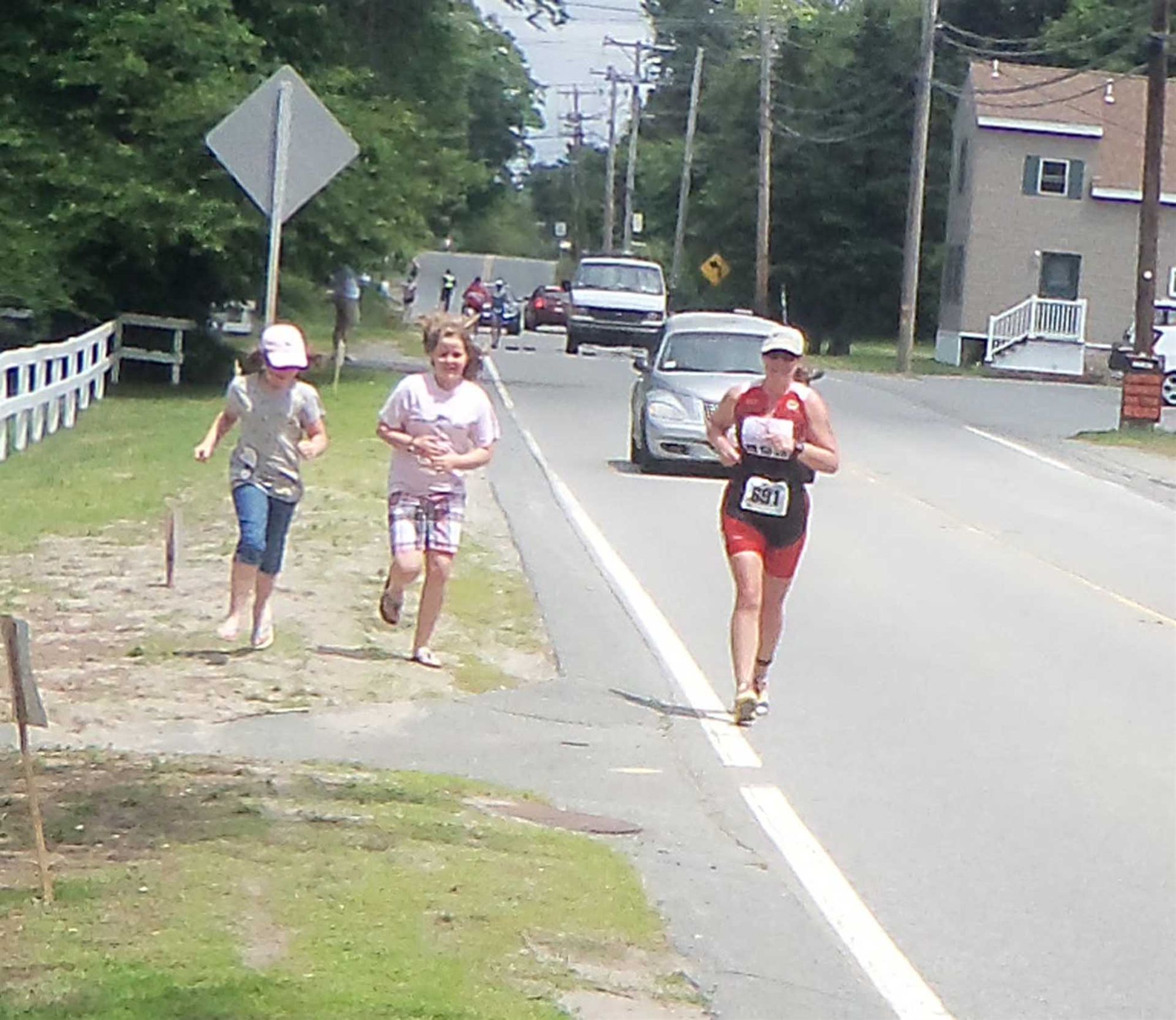Comments: This is where how good I felt on the bike came back to bite me a bit. I felt tired starting out on the run and my legs were a little crampy. My stand alone time for a half marathon runs about 2:15, so 2:30 after swimming and biking isn't too bad - but I know where I can improve. I decided to follow the plan of walking the aid stations and trying to run the rest - which I followed pretty well for the first 8 miles. Then the cramping got REALLY bad, so I allowed myself to walk up hills as well. I had to stop around mile 10 because I could feel a blister coming on under my right pinky toe. I took the sock and shoe off, rubbed the skin and put everything back on. Didn't help. Nutx. The whole time I was running, I kept thinking, "This isn't too bad. It hurts a whole lot, I wish I was faster, I'm uncomfortable." but I knew I was going to make it. Even at mile 12 when I dumped a whole cup of ice in my shirt (that felt GREAT), I knew I was going to finish. Even if I had to walk, I would finish. Around the end of mile 12, I ran past the car (not many Maine Adopt a Pet license plates on old model mini-vans around) and started getting excited to see the family. About another 200 yards up the road (right as you turned into the park for the final (foreverly long) run up the finish chute - there they were! Wooooo hooo! I was so happy to see them. The girls ran for a little with me (Lillian said at one point, "Mom, slow down!" I told her I really couldn't slow down or I would stop.) and then I headed down the chute. As I ran towards the final chute - the announcer read my name, said I was from Camden, Maine. I still had a little mojo left and was able to smile and raise my arms over my head. Wow did that feel great! What would you do differently?: Run more, run faster. ![]() Post race
