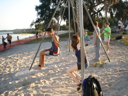 Set up the bike and got my chip. There was a swing set on the beach by the lake, so Leia and I went on the swings until it was about time for my wave.