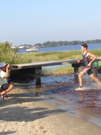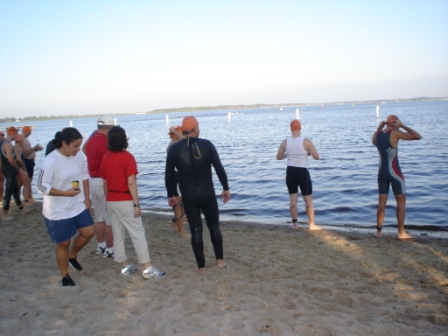 Comments: The swim went pretty well. We all took off and the water was like a redish iced tea. I think I swam ok and didn't overdo it. On the way back to shore I had no idea where I was going, because the sun was right in our eyes. So I just kept people to the left of me and followed them in. What would you do differently?: Not have grabed somebody's wetsuit butt while swimming. It felt like a dolphin though. ![]() Transition 1