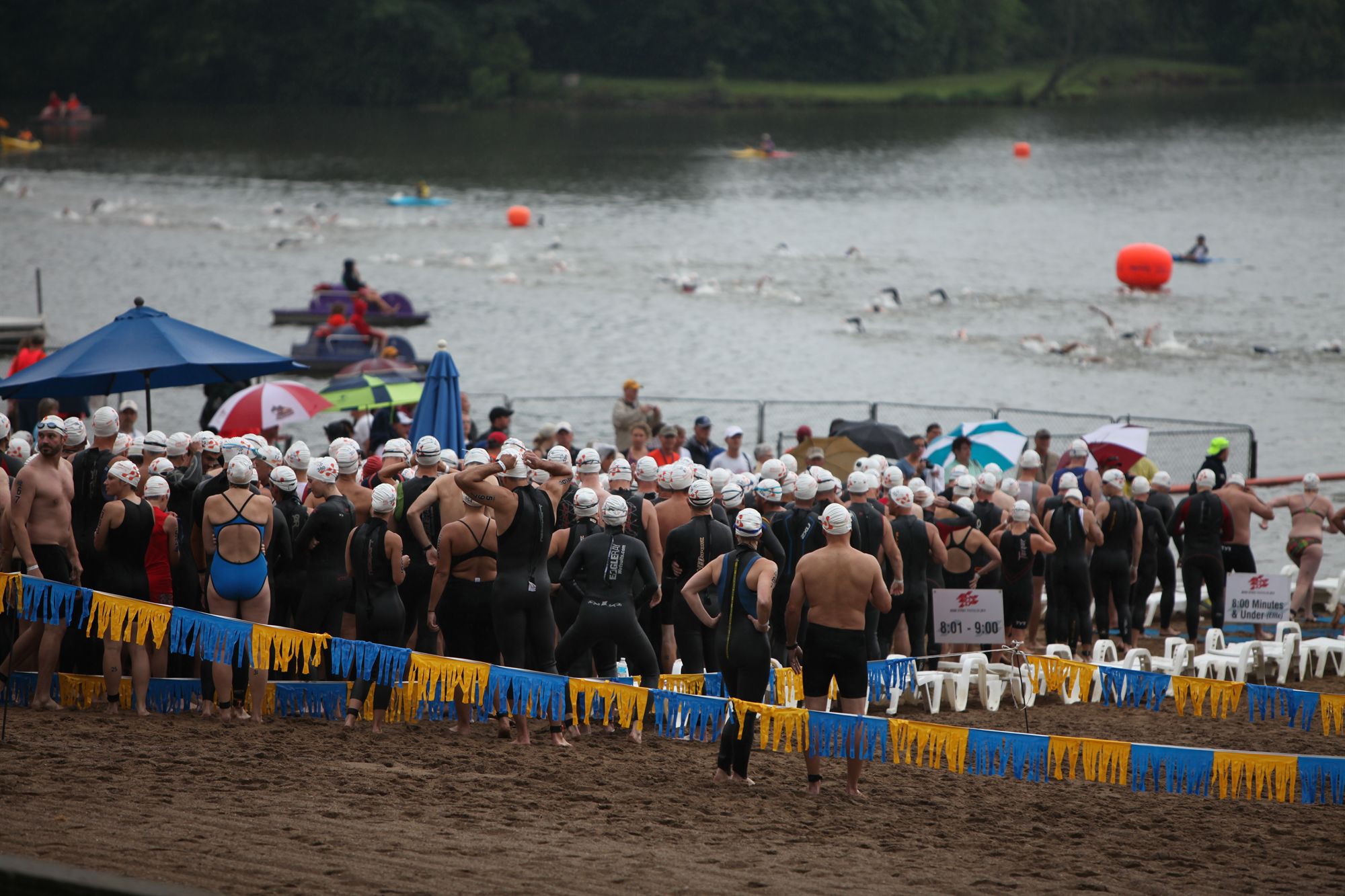 Just a half-lap, then it was time to get lined up. I spent too much time fixing my transition area due to the rain and so I didn't have much warmup time, but in truth the half-lap I took was okay and adrenaline took me the rest of the way.