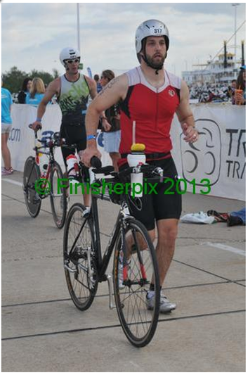 Comments: I had to hold myself back a bit on the bike, especially at the beginning with a little tail wind. I really wanted to open it up and keep up with those passing me, but I held back to conserve for the run. I stopped to pee (which is really rare for me during an event, but I guess it happens) at the second aid station at mile 24. I suppose I was taking in a good amount of fluid if I still had to pee after a couple hours of exercise. Only other stop on the bike was at the last aid station around mile 48. I made myself stop here to give my legs a quick break and take in half a banana. At the end if the bike I saw my cheering squad and was able to finish the bike with a smile and still feeling good. What would you do differently?: Nutrition and pacing was good. I thought I had pretty good execution and I'm happy with my average pace, so I wouldn't do anything differently. I did get a little tired of being on the bike toward the end, but that was likely just from the 3+ hours on a tiny little saddle that is not conducive to the comfort of the male anatomy. ![]() Transition 2