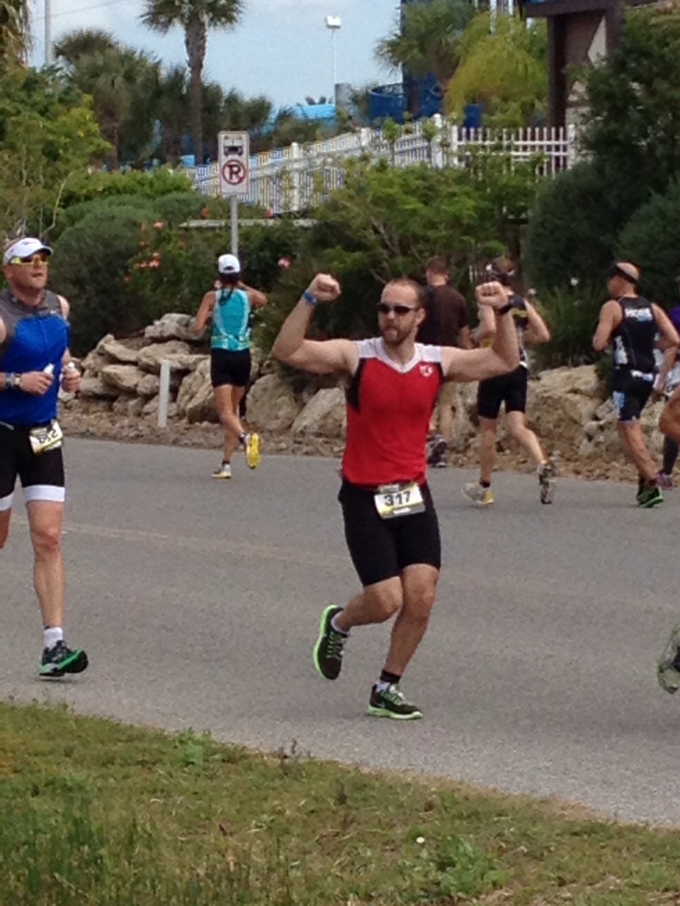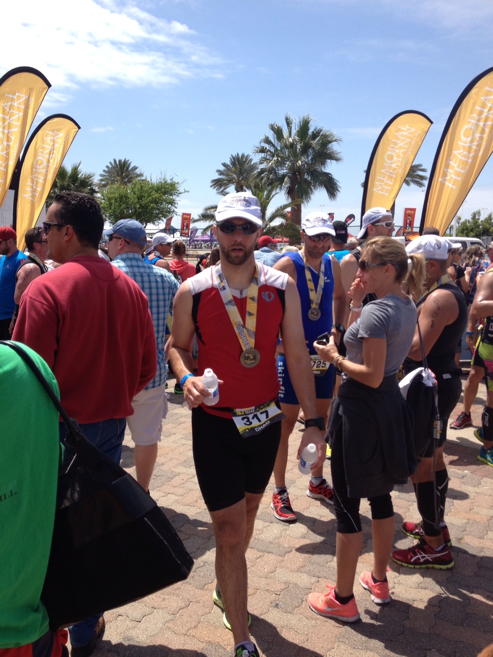 Warm down: After crossing the finish line, I grabbed my medal, a finishers hat and a couple bottles of water. I put ice in my hat then found Keri and some shade. After cooling down, I tried to replenish lost electrolytes without throwing any up. I limped for a bit, favoring my toe. After cooling down and eating a little, we walked back to the hotel room. Later I consumed many a calorie. After all, I did burn over 5,000 calories according to my watch! What limited your ability to perform faster: The heat was definitely the biggest inhibitor to better performance. Event comments: The event was pretty organized. Other than the run, the course layout worked well. The race swag wasn't anything to write home about, but I guess I paid for the IRONMAN branding not the goodies. Despite a very difficult run, I still managed to make my unofficial time goal of 6-6.5 hours. Ultimately, I am now an IRONMAN 70.3 finisher and proud of it! A big thank you to Keri for her support and encouragement throughout all my training and on race day. And I couldn't have done it without Jesus on race day, guiding me and encouraging me every step of the way! Thanks for reading. Last updated: 2012-10-30 12:00 AM