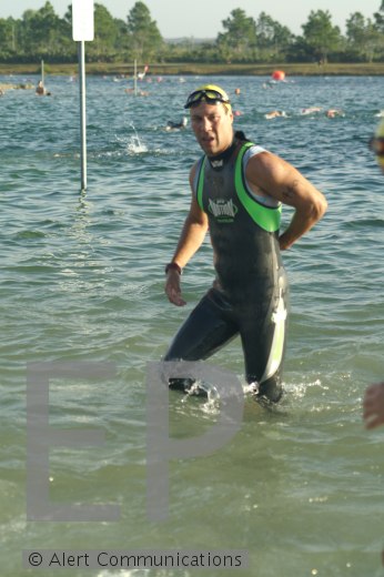 Comments: For not swimming the whole month of Oct & Nov this swim felt great. I worship the almighty wetsuit ;) Also lifting weights for the last 4 weeks helped, I felt much stronger. On the first lap I had a good time swimming easy with some nice drafting. On the 1st lap water exit watch showed a 20m29s lap and I was pretty happy about that as there were still several yellow caps behind me and my freind was right next to me. As I entered the water again for the next lap another wave had just taken off. Second lap was going just as well until about 100 yards or so from the last buoy some moron swam diagnally right across in front of me and kick my goggles. I had to stop and fix them not once but a coouple of times. I saw this guy was going a good 30-40 degrees off course and not stopping. I had to make sure I was going in the right direction just to make sure! BTW, it was pretty hard to see the buoy markers on the long leg going direcly towards the low rising sun. Saw 3 or 4 tall palm trees and used them for guidance until I got close enough to see the buoys better. What would you do differently?: I love the aquasphere googles but when something happens in the water they are hard to get corrected. Time to get some individual eye goggles for the long stuff. ![]() Transition 1
