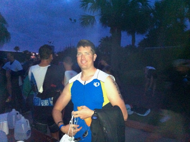 I wanted to have plenty of time to setup my transition area so I set my alarm for 3:30am race day. I woke up just before 3:30 anxious and excited to get to the race site. I had my usual pre-race breakfast of 1/2 cup oatmeal made with 1/2 water and 1/2 milk with 1 tbsp of peanut butter and 16 ounce glass of water. I was at the race site by 4:45am and waiting in line for body marking.
