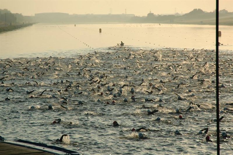 As usual, my idea of a warmup was mostly queuing for the toilets and getting into my wetsuit. They let us get into the water around 10min before the start time, so I got in, made sure my wetsuit was thoroughly filled with water and had a little splash about, then got into the position I wanted for the start with about 4 others from my club.