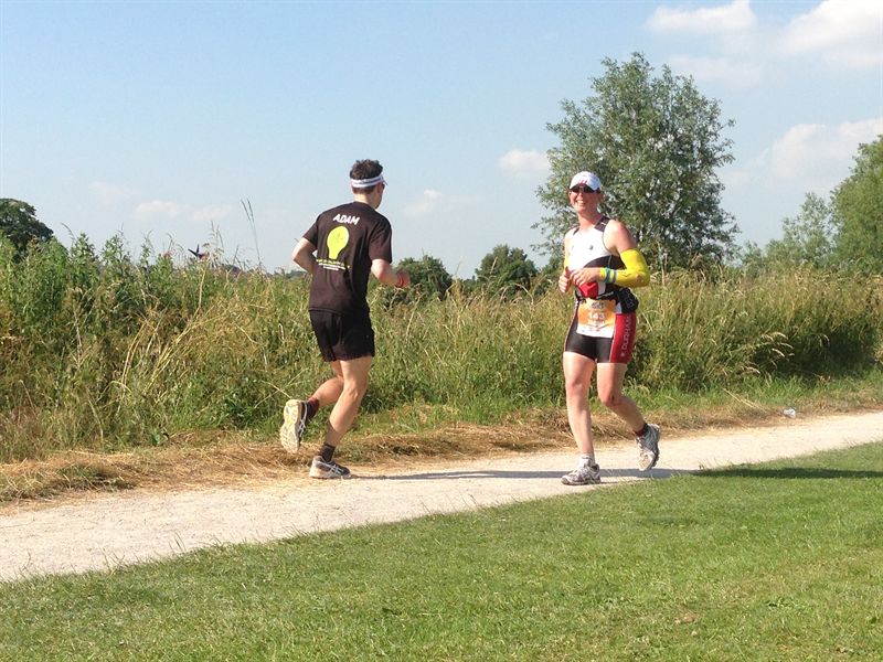 Comments: My overall plan was to try to come in at 12.5 hours total, with a 4.5 hour run. After the problems on the bike I knew I was a little behind my target, but when I started running I felt pretty good, and I only needed to get the run at 4hr 20min to hit my target time, so I started off feeling like I might still have a chance of coming in on target. My plan was to run between each aid station, and walk the aid stations while I took on whatever nutrition/hydration I needed. The first lap of the lake I was running comfortably at about 9.30min/mile. I tried to slow myself down because I knew that was too fast, and I'd tire myself out too quickly. By this time it was getting REALLY hot, so I made sure to take my time at the feed stations, pouring water over my arm coolers, my top and into my hat. I had at least a sip of water at every station, and ate some orange segments, banana or whatever I felt like eating. I remembered reading Melissa's (from my mentor group) race report from Hawaii about cooling on the run, and tried to do everything I could to keep cool. Unfortunately the race organisers weren't quite set up like in Hawaii (or even Switzerland), so there were no sponges or ice. It was pretty much just the water on offer, although there was one area with a sprinkler, and a couple of people at the far end had sponges and were squeezing water over people's heads. One of the aid stations next to the river also realised that they were getting through too much water, so filled a bin with river water and were pouring bottles of it over heads. That was nice, although it came with the warning "keep your mouth closed, DON'T drink this!" As I ran past transition after the first lap I saw Mike from the club coming out and starting the run. He's been really ill, so I was really pleased to see he was still going. We had a little chat before he ran on, but that was the last time I saw him running. After that he was walking every time I saw him. The second lap of the lake I still felt pretty good, but could feel the heat sapping my energy. I was starting to slow down, but was still maintaining enough pace that I felt I could hit my target. I started the first out and back section and met Helen at an aid station. She was running as part of a relay, so was a lap ahead of me, but she said she was really struggling with the heat. I ran with her for a little while, then decided I needed to slow down, so let her go. She got about 50ft ahead of me, and then never got any further away... I saw her run down the finishing chute with Becky and Laura (her team mates), which was pretty cool. I saw quite a few people from my club at various points, which was really nice. I made sure to give them all a friendly shout and a bit of encouragement. As I was going out over the river I saw Dave coming back over the bridge. I assumed he was on his last lap and gave him a high five. There was a little bit of shade along the river for a few minutes, which was lovely. Unfortunately it didn't last. By the time I was running back in for the first time (about 13miles) I realised that my pace had dropped significantly. I was still managing to run (jog) between the aid stations, and felt ok, but just couldn't run any faster. The heat was so oppressive, and although I was doing a good job of cooling, it was still incredibly hard. I was trying not to let it get to me, but I was feeling a little down that I was so slow. As I was running back along the path to the lake I passed Kevin and my parents. I shouted to Kevin that all my target times had gone out of the window, and his response was to tell me I was absolutely killing it, and to keep up the good work. I was really surprised because he knew what my targets were. But he said that there were a few guys ahead of me from the club, and I was gradually catching them all up. The closest was 5min ahead. Turns out he'd been following us all on the online tracker, and was watching me get closer to them. I ran around the lake again, and the next time I went past Kevin he said that the guys from the club were only a minute ahead of me and to keep going. A little further along the path I caught up with Dave and Owen, who were both walking. Considering Dave was aiming for 10 hours I was really surprised to see him, and knew things had gone horribly wrong. That was when I really realised that most of the people around me were struggling a lot more than me. The vast majority of people were walking, with a very few managing to alternate walking and running. There were also quite a few getting medical attention as they were passing out all over the place. I literally passed dozens of people on the run. At the far end of the out and back section I stopped at the feed station over the bridge. I decided to try having some crisps, and stuffed my mouth full of them. I then asked where the water was, and they informed me that they'd run out of water! I had to drink something, so I swigged some coke, but wasn't impressed with that. Unfortunately the next feed station on the route was the same one (after looping back), so that was a long section with no water. They put on an emergency water station a little further on, but it made that section a lot harder. And then I realised I'd passed Martin (the other guy from the club who was ahead of me). I was a little confused because I hadn't seen him, but it turns out that he'd stopped for a toilet break and I'd run past. I went past Kevin and my parents for the last time and said I'd see them at the finish (I had to run round the lake). Kevin was cheering me on for passing the guys from the club. I stopped at the next set of restrooms for a quick comfort break, much to the dismay of a friend who was there supporting her husband. I also took my time at the last two feed stations (noting that Andy Murray had won Wimbledon, and Chris Froome had retained the yellow jersey!), keeping cool and taking on water. As I passed the 25 mile marker I glanced at my 