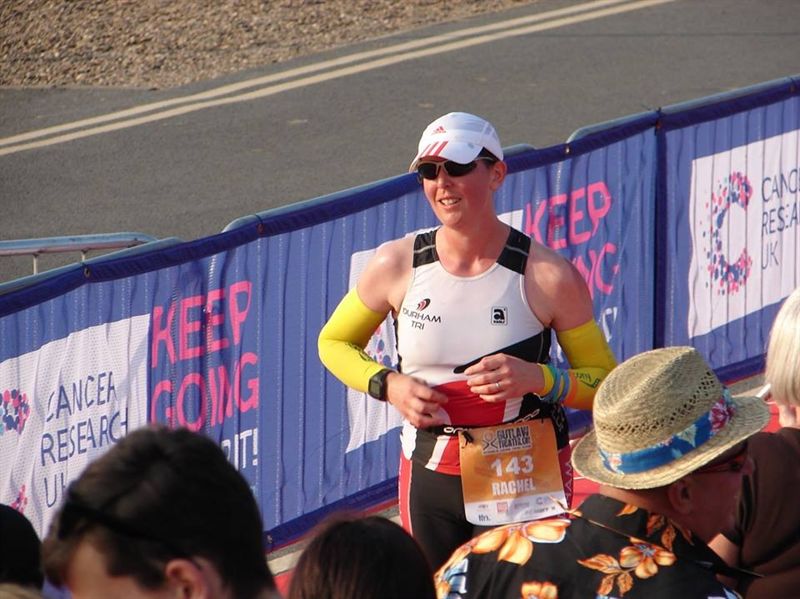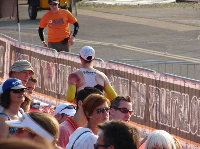 Warm down: I picked up my finishers T-shirt and medal then went to the medical tent. I showed them the road rash, and suggested that I should probably get showered before they cleaned it, which they agreed with, saying I should try to get as much gravel out of it in the shower. I went up the stairs (the signs said "good luck getting up the stairs Outlaw!", which had seemed really funny the day before...) and was going to look for Kevin. However I saw someone with a cup of tea, and without even thinking said "where did you get that?" and headed for the food area. I didn't really feel like eating, but they had soup, so I had a cup of tomato soup and selected a main and desert (as well as my tea). I stood talking to the volunteers while I drank the soup because I didn't have enough hands to carry everything, and I knew that if I sat down I wouldn't make it back up to go and find Kevin. After drinking the soup I felt MUCH better. I found my parents and Kevin in the cafe, so I sat down with them, and without really thinking about it started eating my food. I hadn't had any choice (there was only one vegetarian option out of the 8 items), so I wasn't really interested, but then I realised that I'd eaten it all and was working my way through desert! Considering last year I hadn't been able to eat properly for nearly 24 hours after the race, that felt really good. I decided to skip the massage and get showered. We managed to find somewhere that Kevin could come and help me, which was good, because when it came to getting the gravel out of my shoulder, he had to rub it under the water because I couldn't reach. That was probably the most painful part of it all. Once I was clean and dry we headed down to the medical tent where they cleaned the wounds and put dressings on them. Then we headed back to our accommodation via Pizza Hut, and had pizza and beers (mine was low alcohol) with our friends. Oh, and I weighed myself in the morning, and then again when we got back to the cottage (before the pizza), and I was 0.1kg heavier in the evening. So I had NO weight loss overall. Kevin said he'd guessed I'd lose 8kg in water, so that's not bad... What limited your ability to perform faster: Overall I think just the heat (and the crash!). Taking into consideration the conditions I think I pretty much nailed it. I didn't hit my targets for the bike or the run, but based on how I felt I'm pretty sure that I've got a 12 hour Ironman in me. Last year I wouldn't have thought I'd ever be able to say that. Event comments: This is a fantastic race. It's well organised and good value for money (it's half the price we paid for IM last year). The volunteers were fantastic, and for a British race it's really well supported (there were families sitting in garden furniture cheering us on for the bike - that's unheard of over here!). It's a great, flat bike course, so good for getting fast times, and I'd love to do it again. Oh, and I may be on telly! The guy interviewed me on the run when he saw my road rash. I think I probably sounded slightly stupid, but it was fun. Last updated: 2013-03-27 12:00 AM