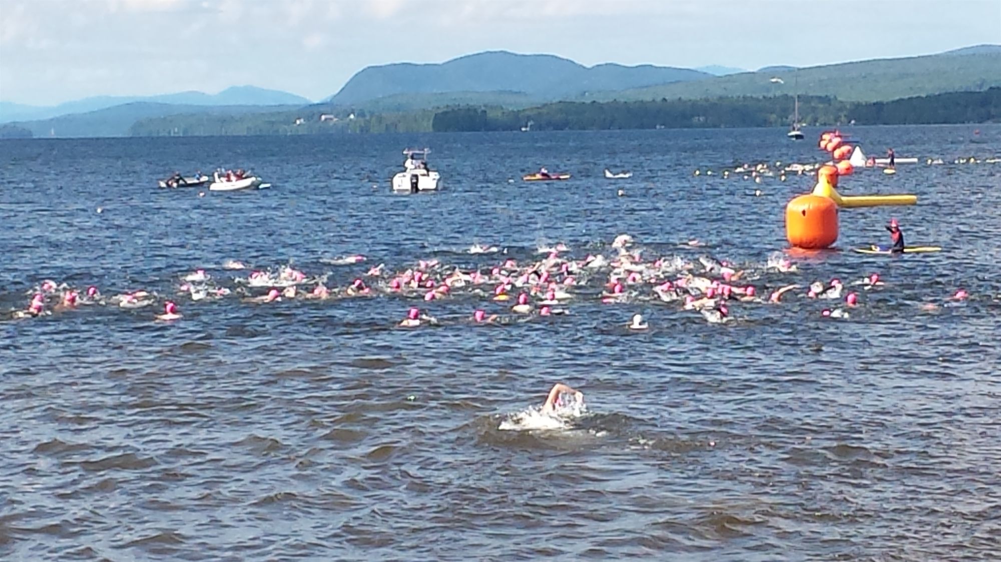 Entered the water a few minutes before start and swam a little. Water was freezing at first but once acclimated it was perfect. I am used to training in a cold river, so this was good for me. There was a little wind, and some waves, but no chop. I watched a few groups for their start and cheered them on.