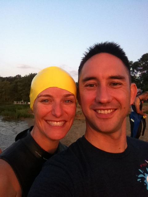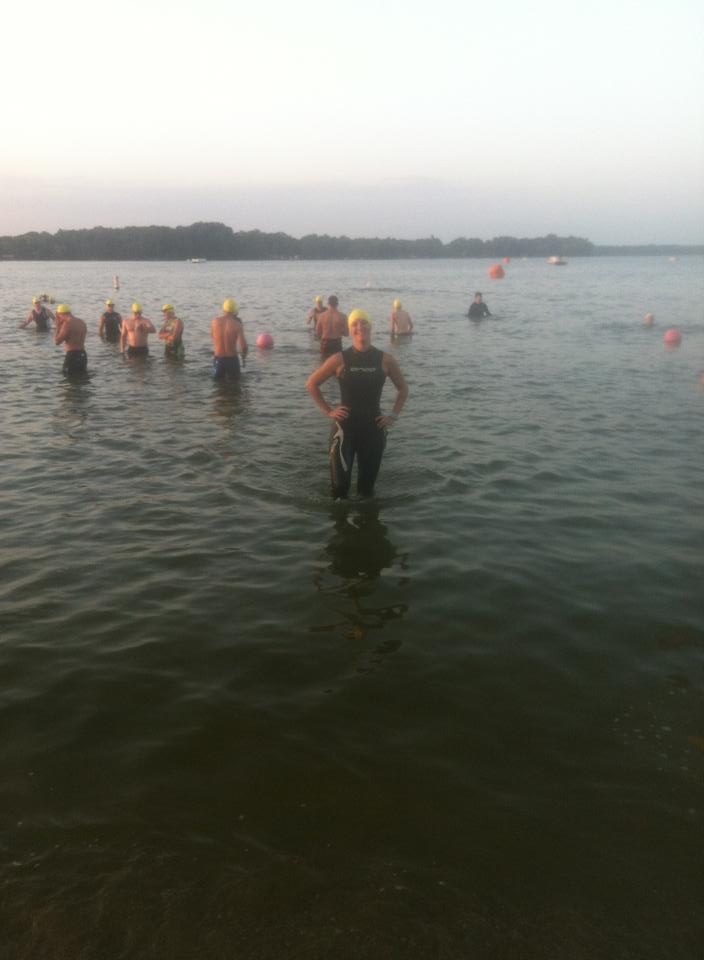 We got to the race site with plenty of time to get things sorted, meet Dina (yay!), get transition set up and to hear the race director say that they somehow found a place in the lake that was UNDER 75F. Where the heck they found that, I don't know. I figure they must have dumped a bag of ice into the water and taken the reading immediately because there's no way that lake was wetsuit legal. However, after thinking about it I decided to go with the sleeveless suit so that I'd get the benefit of buoyancy. :)