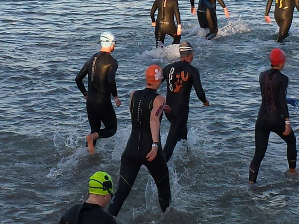 Usual - PB & Honey on wheat toast on drive to start. Water, gatorade and coffee (they were actually making fancy coffee drinks at the race start - I love Australia! I just had long black), GU right before swim start.