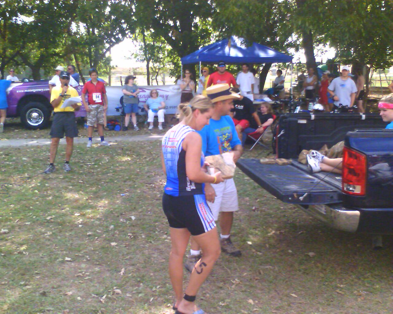 Comments: It was hard. The first 1/2 mile was through a hilly field to get to the paved trail. Then it was very slightly hilly, nothing really. Hit each aid station twice as it was an out and back. Drank 1/2 cup of water each time and threw the other 1/2 on my head. Worked out well. Chris caught up to me about 1/2 way and said I had been his rabbit. We chatted for a minute, then he was my rabbit on the way in. Worked out well. As I was running out, I was like a pubescent boy looking at the girls' legs as they were on their way in. I had this feeling in the back of my mind that I hadn't seen anyone in my AG all day. Hummm...odd. They were all in older AG's and great athletes I had seen at other races... Right after I hit mile 2, Laurie was riding in on her bike and cheered for me. It was a great boost again. I thought about the swim and laughed. Felt pretty good after that and finished strong. I shouldn't have walked at each aid station since I still had plenty of gas in the tank. Oh well. What would you do differently?: Not walk, but I was scared I wasn't going to be able to run strong the whole way since I was under prepared. ![]() Post race
