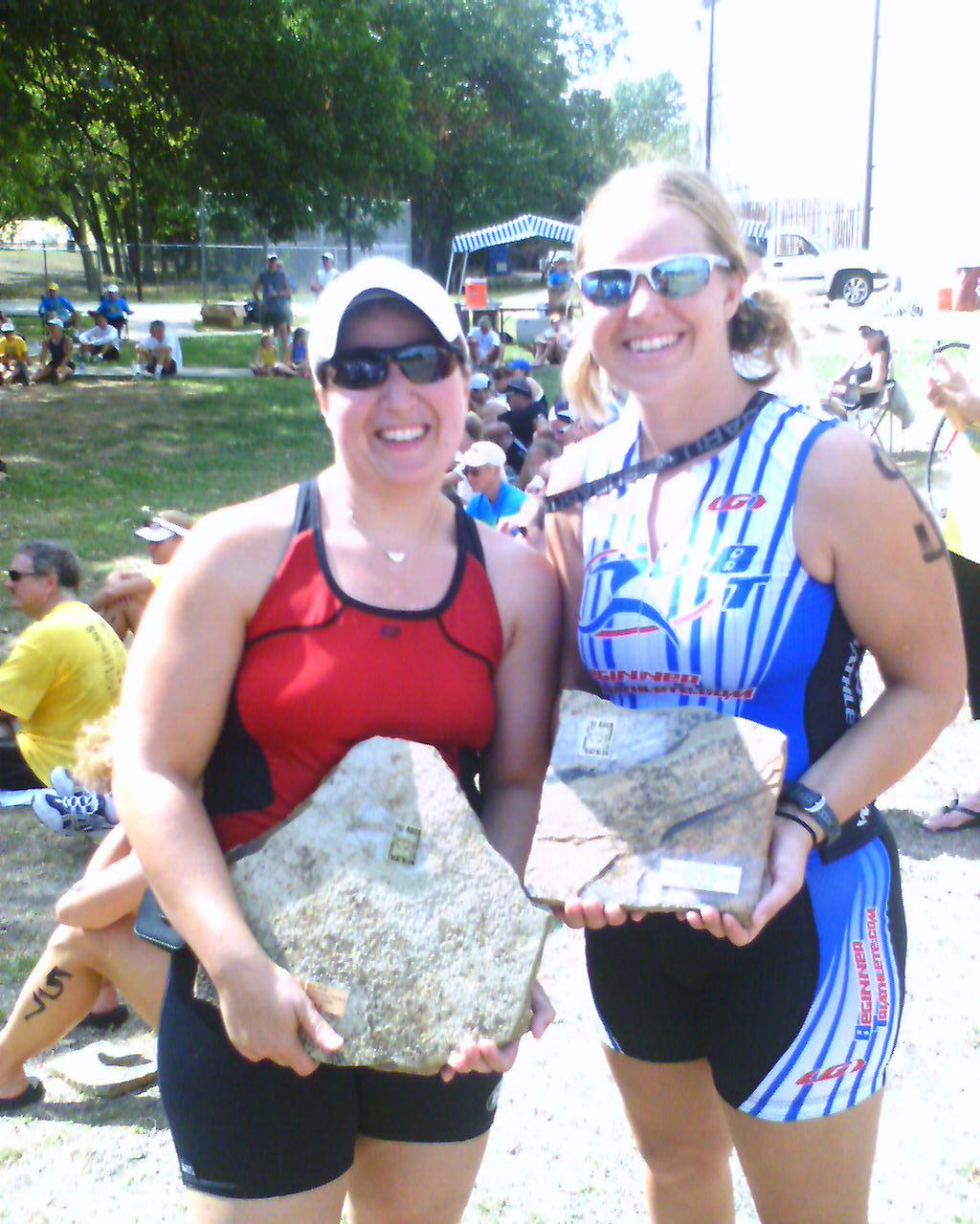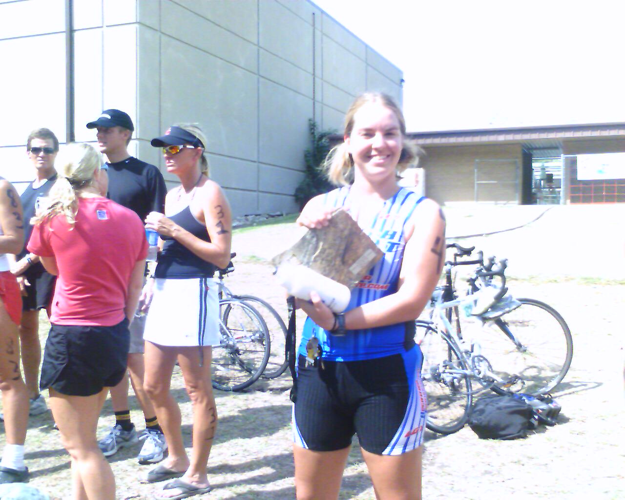 Warm down: Immediately after I took off my chip my ankle started burning. Blister. My first tri blister! Whoo hoo! It hurt but oh well. Found the great 'straps and got my post race food and beer. Found a spot and waited for Laurie to come in. Hung around for our awards, 2nd in my AG and Laurie got 3rd place Athena! Rock on for 2 non-training triathletes! As I'm getting my award Jack the RD (and also Aaron's sponsor!) says "You may all not know Haley, but you know her age grouper uhhh...significant other Aaron, the guy that carries the American flag. Well he's not here because he's carrying the flag in Ironman Canada today!" I laughed and was embarrassed but so proud of him. :) I got lots of cheers. Talked with our friend Trey who placed in his AG as well and he made fun of me for being upstaged by Aaron and he's out of the country. Go figure. What limited your ability to perform faster: Non-existent training. Event comments: Jack always does a great job, his events are very organized. I really had a mediocre race. My time doesn't come close to my sprint PR, which is fine, this bike was much more difficult. Before I found out I was second in my AG I told Marcy "I swam great, nothing bad happend on the bike and I had an Ok run. I can't be upset or complain. That being said, I guess it was a good race." Then Laurie and I got awards and the race wasn't small, so it became a great race! Last updated: 2006-08-22 12:00 AM