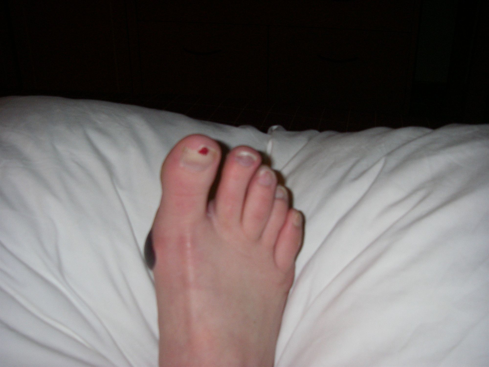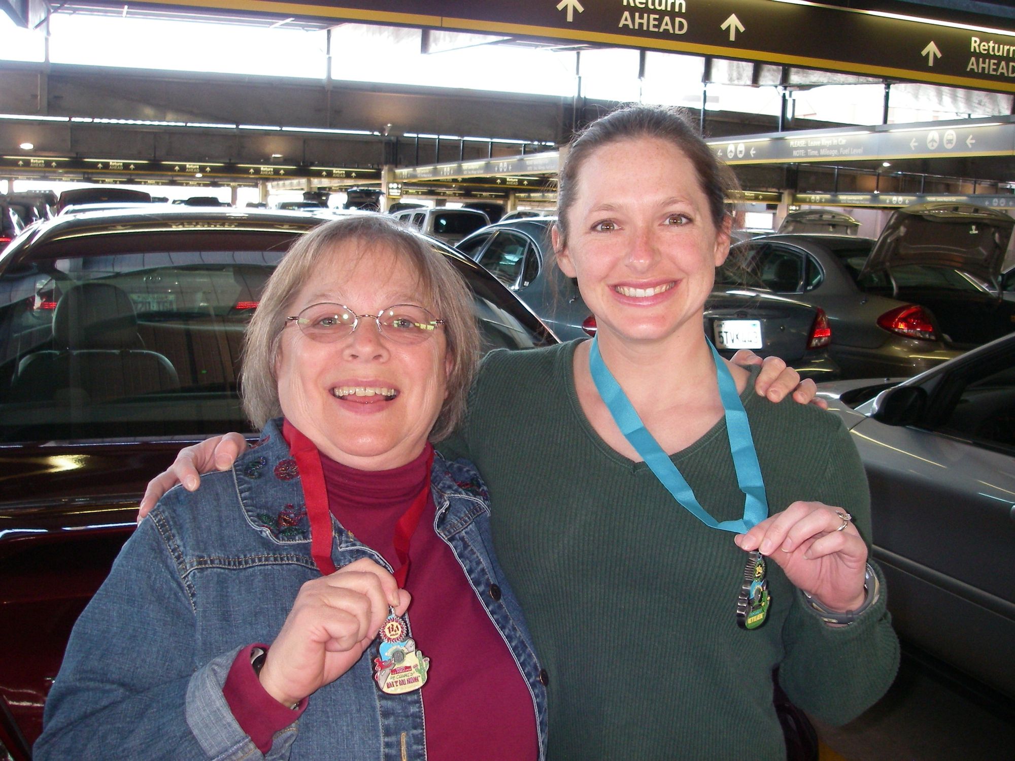 Warm down: Lots of standing around in line. As soon as I crossed the finish, I was in line to get my medal. Then I was in line to get my space blanket. Then there was the line to get my timing chip clipped off. Next came the line for finishers photos, then the line for slippers (:) ). After that, the line for food--this was a very long line. I picked up one of everything they were handing out. Then I went to the family reunion area to look for Mom. I didn't think I had made it in in enough time to watch her finish. Turns out the half started late, and it took 45 minutes after the gun went off for them to start her corral. I could have made it after all! Once I found Mom, we made our way to the checked-bag area to get our things, then shuffled through the parking lot to the car. It was while I was pulling on my warm-up pants that I first noticed the bump on the side of my right foot. Through my sock, it looked like I had a bunion (which I typically don't). I figured it was a blister (although I hadn't really noticed too much in the way of blister pain during the race), and decided to wait and look at it once we got back to the hotel. Turns out, it was a massive blood blister--pretty much looked like I had a plum stuck to the side of my foot. What limited your ability to perform faster: The cold and nutrition issues were probably what caused my legs to cramp. It may also have been a lack of muscular endurance. I severely sprained (and possibly broke) my foot the day after I registered for this marathon in October, so for the first few weeks, my training was limited to aquajogging. Otherwise, I felt fine throughout the race. Event comments: I may be a bit spoiled by triathlons, and I'm willing to admit that. ;) The aid stations seemed very spread out, and I was suprised that they only had gu available at one spot (mile 19 for the marathon), but I understand that this is common for marathons & half-marathons. Evidently though, they ran out of gu on the half-marathon course by the time my mom made it to the gu station. It would seem that several of the bands and most of the cheer squads that were supposed to be on the course were put off by the cold on race morning. I was expecting more in the way of music and cheering, not that music is essential to a good marathon. The post-race area was a bit too spread out, and I never found the post-race massage tables (apparently they were there, I just didn't see them). All-in-all, though, given the sheer size of this event, I have to think the organizers did a pretty darn good job. With nearly 40,000 participants, keeping these races on track had to be quite a challenge! Thank you to Julia, her sister Ann, Adam, and Mom for helping make this a great weekend! It was fantastic to share my first marathon experience with each of you! Last updated: 2006-10-06 12:00 AM