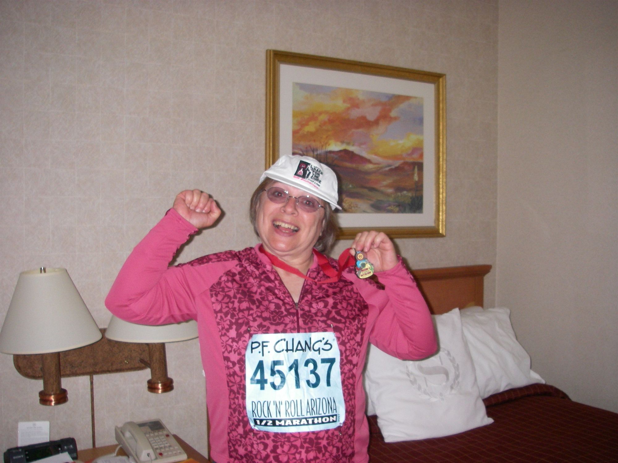 Comments: I started out pretty well. My pace was strong, and I cardio-wise I felt great. I had dressed as warmly as I could, with a sleevless tech top under a long-sleeve tech top, and a long-sleeve Race for the Cure shirt on top, figuring I would ditch it along the way (which I did around mile 6). Unfortunately, I hadn't planned on needed anything other than shorts, so I didn't pack tights. At the second aid station, I discovered a flaw in my nutrition plan. Aid stations were spaced about every 1.5-1.8 miles apart along the course, with Acceleraid at every other aid station. I opted to stick with water and Hammergels, taking a gel at about every other aid station. I had decided to use 2 gel flasks, with holsters that attached to my number belt. But because of the cold temps, and because they were not in a pocket next to my body, the gel got very cold and very thick--very difficult to get out of the flasks. Think trying to suck gummy bears through a straw. I was using both hands to squeeze the flasks and sucking hard, and hoped I was getting enough. I made sure to use see-through flasks, but the flasks were staying "squeezed-in" after each serving, making it difficult to get a read on how much I was really taking in. I did what I could and hoped for the best. I felt strong through mile 10, and was cruisin'. Mile 11 my hamstrings started to tighten up. I stopped, stretched, and kept going. I knew that around mile 12, the course would flatten out a bit, and thought maybe the change in grade might help. No such luck. It felt like the cold was just freezing up my hamstrings, and then my left calf decided to get in on the act. I stretched periodically, and walked the aid stations, and the change of pace seemed to help a bit for a little while. But shortly after I resumed running each time, the legs would tighten up again. This was getting pretty frustrating, as I felt fine cardio and energy-wise. I just couldn't get my legs to turn over that fast anymore, and I saw my pace slip. First, I saw 10-something miles, and thought, OK, if that's what I can do, lets just try to keep it there. I was sub 10's for the 1st half, if I can do the second half at 10-somethings, it should average out to about 10's for the whole race. Then came the 11-somethings. OK, not great, but not bad. When I registered for this race, I was expecting to average 12:30s, so 11's wouldn't be so bad. This was around mile 17, and I started telling myself "just 3 5Ks--that's all that's left. Starting ticking them off." When I saw 12-somethings, I was getting frustrated, but I reminded myself that 18 months ago, I was working up to running 30 minutes consecutively, so no matter my time, this was an accomplishment. When I saw 13-something, I got mad. Now that just wasn't right. I really wanted to make it to the finish in time to head over to the half-mary finish to watch Mom come in. 13-somethings were not going to get it done. At this point, I was at about mile 23. Just a 5K to go, and that I could do. I started picking up the pace bit by bit. Around mile 25, I saw a woman who was slowing down. I told her "We're almost there! Strong finish!" She picked it up and started keeping pace with me. By the time I hit the last aid station (around mile 25.5), I just wanted to get across that finish line, so I blew past the water and kept on trucking. I lost my temporary running partner at that point. Right around mile marker 26, I ran past a band playing "The Joker," which really pumped me up a bit. I was singing and throwing fists in the air, revving the crowd up, and FINALLY hitting a runner's high. I never experienced the runners high in training, and it was great to get a taste of it in the race. Guess I have to run 26 miles more often?? I came around a corner, and there it was. The finish line, the archway, the timing matt. The finish was right in front of me. I tried for yet another push, and finished with my hands in the air. What would you do differently?: Pack running tights, use packets kept in my shirt pocket if the weather is cold. ![]() Post race