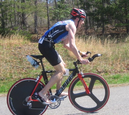 Comments: Again, I know this course and I know where the false-flats are, where the downhills are, where the turns are, etc... I thought my bike split was going to be a bit faster, but I'm satisfied. I only lost two people on the bike, I know that one was not from my AG, not sure about the other. I passed A LOT of people. At one point I was counting, and then realized it was stupid, because a lot of these people had been doing the duathlon, and they were on mountain bikes and I needed to just focus on riding anyway. The only part of this course I don't like is the first and last 2 or so miles, which are inside the state park. The edges of the road are recently resurfaced, but the inside is not, and it's kind of rough. If you want to pass, you have to pass on the rough section. Rather annoying. I had a great move coming back into the park. For about 4 miles I had been going back and forth with a kid riding a Cervelo, who was in my AG. When we made the last right turn to come into the park, there was a line of cars waiting to get past the little hut where you pay the park fees, so everyone rides to the left of this. Since I knew it was coming, I stood up and accelerated VERY hard coming through the turn, and blew past him and three other guys. Never saw him again. That made me smile. What would you do differently?: Not much. I have only had my new bike about 10 days, so obviously I would have liked to spend more time on it. Also, I didn't have a chance to get back out to Plum Grove to have them tighten up the cables, so the gears weren't shifting as smoothly as I would have liked, but there was no skipping, so it wasn't too bad. ![]() Transition 2
