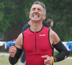 Comments: I was worried that I fried my legs on the bike and thought the run would not be too fun. Up the first hill I really had to work hard and it seemed like I was slow as heck. The 2 guys that I was going back and forth with on the bike had about a 30" and 10" lead on me after the hill. My legs starting responding after the hill and I started catching the first guy in front of me. I passed him at about 1.5 miles and about 30" later I could hear him behind me breathing hard to try to bridge the gap. I had set my sights on the next guy up in front of me, so I thought "OK buddy, see if you can stay with me while I surge". I put on 3 different surges as I tried to catch the other guy and the guy behind me was breathing harder and harder trying to catch me. Although I was focused on catching the guy in front of me I have to admit I was getting perverse satisfaction out of making the guy in back of me suffer. I finally caught the second guy at the 2 mile mark and my legs were feeling great - I seemed to get stronger with each passing minute. My second run leg split was only 30" slower than Brian Bich - national AG champion 40-44 and 2nd ranked in the nation in triathlon for 40-44. His first run split was 1min 5 sec faster than mine. He killed me by 4' 15" on the bike though. What would you do differently?: Nothing - got stronger as the minutes passed - good sign for HIM and IM races later this summer. ![]() Post race