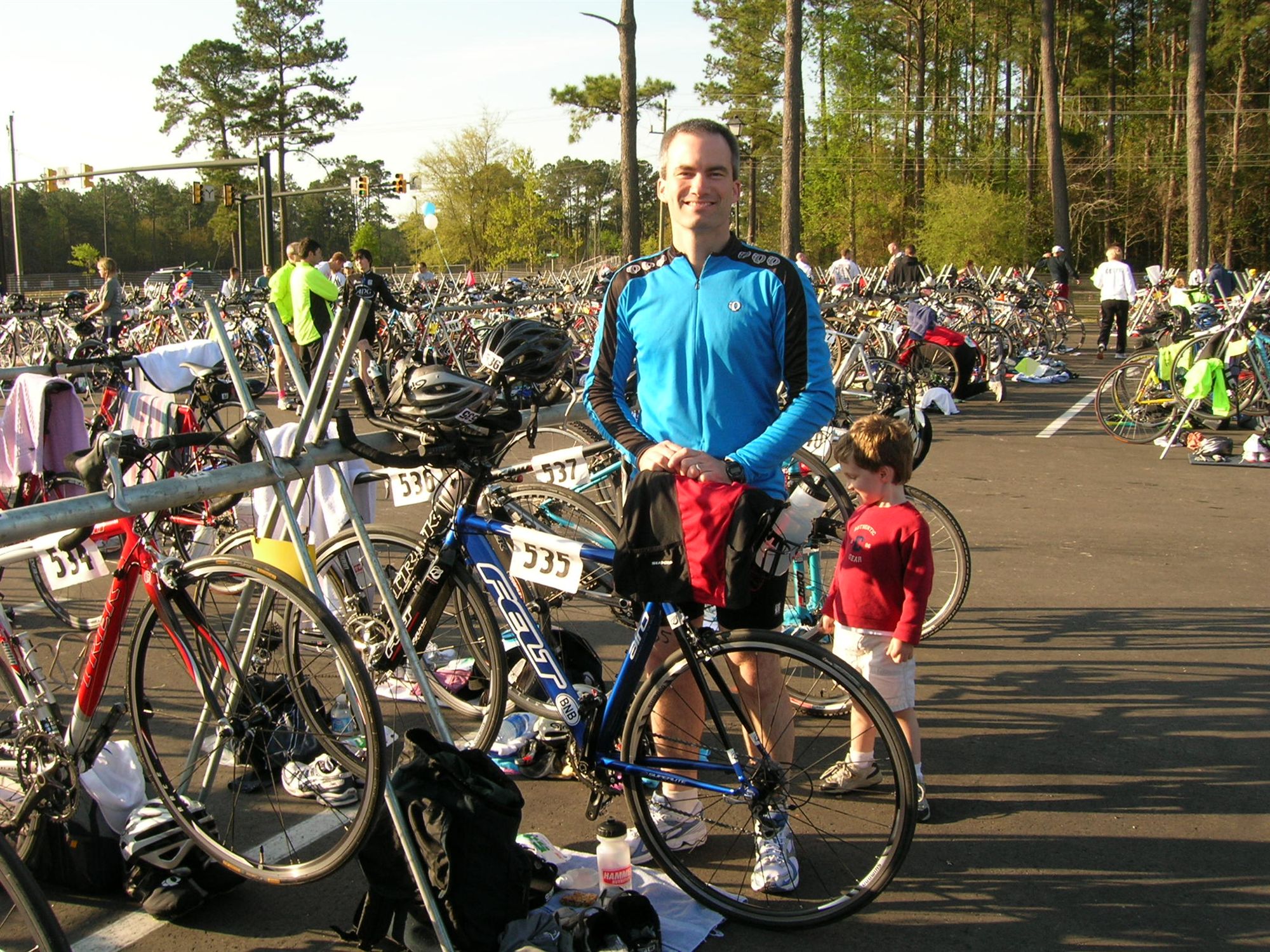 Up at 5:45. Rouse the family. Eat a banana at 6:30. Out the door at 6:55. Arrive race site 7:20. Rack bike, put down T-mat. Meet up with Carlson, chat a bit (he's racing my age group, too)