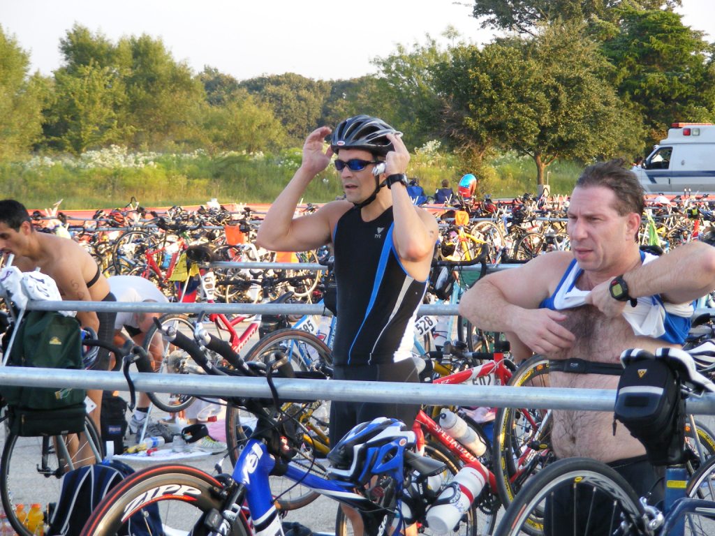 Got up at 4:45 and ate a bagel and a banana and drank a cup of coffee. It took about an hour to get to the race. That put me further behind than I wanted to be. I had to get my timing chip, set up my transition area and visit the toilet.