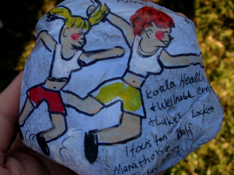 Comments: This was a half marathon relay that I did with 3 friends from Houston Fit, my fall and winter training program for the Houston half-marathon in January. Beeptx and I ran the second leg, and our two first legs finished together. I think there were PRs for all 4. The prize for getting 3rd in the women's mixed relay division was a cool painted rock - check out the picture. Most of the people doing this race weren't on relay teams but were racing the full half-marathon distance, so it was weird coming out of the chute with 10-minute milers who were starting their second half of 13 miles. I tried to keep that in mind when I was near the finish and trying to get the umph to kick it in - these people had done 13! What would you do differently?: More interval training at race pace, but that'll have to wait until after the tri off-season because for now I'm focusing on swim technique.  Post race Last updated: 2007-09-22  12:00 AM |
