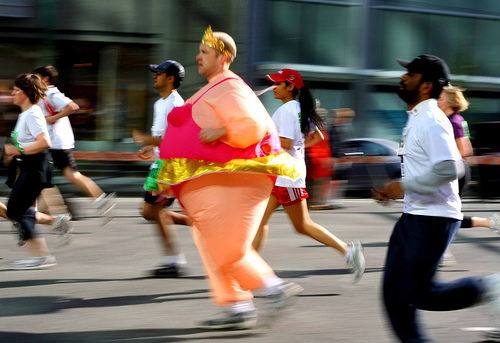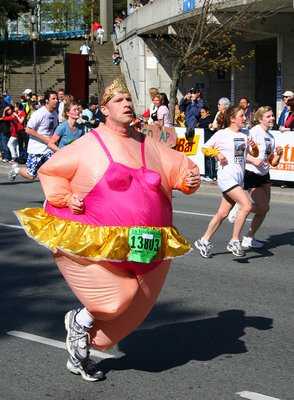 Comments: 2006 was the year I did the Sun Run in the inflatable ballerina suit to raise money for the Juvenile Diabetes Research Foundation. http://ballerinadad.blogspot.com/ It turned out to be a really hot day. It was a lot hotter in the suit than I thought it was going to be. I started in the second wave of green runners. I actually passed a lot of people. The typical comment was "what the heck is that!" By the end, I was cooking inside the suit. It was like being in a tent in the hot sun with all the zippers done up. The entire suit was soaked on the inside from condensation and sweat. Mid span on the Burrard Street Bridge I felt something banging against my leg. I thought "Oh crap, the fan fell out again". So I stopped to get out my duct tape from my fanny pack and attach it back in again. It turned out my fanny pack had come open, and it was actually my roll of duct tape banging against my leg. So I got somebody to zip me back up, and I took off running again. It really was a lot of fun seeing people's reactions. I got interviewed by Shaw TV and Global TV at the finish line. Hopefully I will find a few more shots in the next few days that I can post. Altogether I have $725 in pledges. I have about $60 that I have to take to the JDRF office, along with $665 in online donations. ![]() Post race