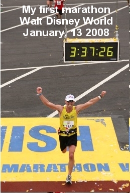 Comments: Woke up with sore quads and tight I-T bands (never had either problems). Legs were sore from the start. Didn't feel my calves past 5 miles, upper legs pain was too much I think. From 5 to 10 miles I kept having to pull my running shorts up cause they were so heavy with sweat they were falling really low (probably gave some people a quarter moon ;-) I think cuz they were put in the dryer the night before on really hot, and band lost elasticity. Had no problem in the half the day before. At mile 10 I walked 10 seconds so I could tie them. It was alright from there on out. I started right at the front of corral A, and had no problem with slow people in front of me. I always made sure I never got in anyone's way. The 3:10 pace group was about 5 rows of people behind me. My goal was 3:15, so I wanted to stay in front of the 3:10 group for the first half, then I'd have 2.5 minutes to slack off in the second half. The 3:10 group past me around mile 8, and I hung with them til mile 9, and when I past the half point at a 3:11:44 pace, I couldn't see the 3:10 group anymore. Upper legs (quads and hams) were getting super sore, and had to slow the pace down. Stopped at 4 medical tents. Each time I got a big squirt of bio-freeze and twice took a Tylenol. The bio-freeze gave me immediate pain relief for about a quarter mile. I didn't take any past 21 miles because I heard of the girl that died last year and they said it was due to pain relief ointment, and I didn't want to over do it. I don't think I walked til after I met my support crew (Dale) at around 17.5 just outside Animal Kingdom. It was great. Dale took out my empty fuel bottles from my belt and put in fresh bottles while I "sticked" my legs. I also took a 20-oz bottle that I premade up with fuel.after that, the carmping of the quads and hams became so unbearable I had to walk. I walked as short as I could until I could bear the pain and run again. I did that for a while until the quad pain was worse while walking then running. I took bananas twice, once around 16, once around 19. I never trained with eating bananas, but I was going so slow at that point it didn't hurt me. After mile 5 I did walk some of the water stops briefly. Every water stop I splashed 2 cups of water on my head. After I started slowing down I wasn't hot any more where I needed to do it, and started drinking powerade at the stops. My fuel belt contained 6 X 8oz bottles. 4 had a thick Hammer perpetuem mix (carb/protein) and 2 had 2oz hammergel and one of those also had 5 drops of creatine which I planned on taking at mile 10, but forgot til after mile 11. One of my pitstop bottles also had this hammergel/5-drops of creatine mixture which I took after mile 20. At the 23 mile mark, I decided not to walk anymore in hopes of breaking 3:40. Mile 25 I did walk around 15 seconds on an uphill section, but I did manage to run the last 3.2 miles, actually doing the last 2/10 at a 7:34 pace. It seemed like there were either live bands or spearkers pumping loud pre-mixed music every half mile. There was one 1/2 mile stretch where there were tons of highschool cheerleaders cheering you on :-) In the parks, and many other stretches of the course, there were plenty of spectators cheering every single runner going by. I bet I heard "Go Joe" or "Good Job Joe" or "keep it up Joe" at least 400 times (our first names were on our race number bibs). I took 14 Hammer enduralytes that day. 2 before I left for the race, 3 around mile 5, and 3ea 3 other times during the race, but I still had bad leg cramps. Complaint: One of the early water stops, I think in EPCOT, the volunteer was saying "Water" when handing out the cups, and I was about to splash it on me, when I realized it was blue powerade. Well, I got pissed off and started cussing her out, she probably didn't hear me, but everyone around me did, because there was no more water to get once I passed that stop until the next water stop. I was just so hot, and I guess literally hot under the collar. I feel bad now for doing it. But it would've really sucked if I had to run the rest of the race with sticky blue stuff all over me! There were plenty of photographers. I tried to raise my arms or give a thumbs up at each one. Plenty of Disney characters to stop & have fun with... I just hi-5'd a few, but didn't wanna stop. Since around mile 12, My feet were so soaked from sweat, it felt like a huge blister was forming in the middle/front/bottom of my right foot. I couldn't believe it since I body-glided so well. It never got painful, but it was an uncomfortable feeling for the rest of the race. I had dry socks at my pitstop after 17, but I figured since it wasn't real painful, I wouldn't change socks then. What would you do differently?: Not walk around 10 miles thru Disney parks on Friday, and run a 1:49 half marathon the day before a marathon I'd hope to BQ in (especially since it's my first marathon!) I guess. ![]() Post race