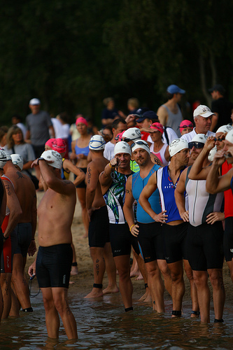 Comments: Standing on the shore just before my wave started, I looked down the beach about 100 yards, and there is Aaron with his 4' long camera lense trained on me. He is standing in 2 feet of water 20 yards off the shore. My first thought was to run down there and pull that expensive camera away from the water, but instead I just smiled and waved. Free advice: If anyone is in front of Aaron's camera lense, do not 'pose' unless he asks you to. He prefers an unknowing prey when he is shooting. He reminded me of this several times throughout the day, in addition to constant reminders that he thinks my bike is ugly. But, I digress. Well whadayaknow? I actually had a swim game plan and executed it. Standing on the shore, it sure in the hell looked like a lonnnng way around the buoys. The longest portion of the quasi-trapezoid was right into the wind/swells, which was kind of fun. As our wave took off, I decided not to sprint knee-high into the water, as this was instant HR jackage, and I wanted to keep it low to help with my normal swim-breathing problems. I waded until I was nipple-deep and then started off a nice slow pace with some of the other dudes in the back. I caught most of the pack early on and got to do some thrash-about swimming, which was fun too. I don't know why the swells and the mosh pit was fun for me, but I really did enjoy it. As we got about 400m into the swim and were approaching the 1st turn I slowed to sight and get a deep breath and my torso dropped. And my feet touched the ground. WTF? I stood for about 3 seconds and then remembered I was in a swim. I looked to my left on my next stroke and saw 5 guys walking as I passed them. That was weird. Anyway, I kept going and rounded the 1st buoy and headed down the long stretch to the final turn. Once a-freaking-gain, there were yellow caps in front of me and of course we were swimming to the yellow buoy's. So, every time I sighted, I thought I saw the buoy closer, only to realize I was seeing someones head. Nice. Last buoy rounded and I was on the home stretch. I saw the shore in the distance and a beautiful rainbow. I smiled. Then I frowned. Rainbow = RAIN. Duh. I put that out of my head and I concentrated on rolling my shoulders and a nice nasal exhalation and made some good time. I swam long after people were wading in (and passed them) and kept on going until my hands dug into the ground. I popped up and let out a yell and sprinted up the hill. As I passed the masses there to cheer us, I made a comment that brought some laughter to them. "Man, I should have skipped the Masters class this morning!" Off I went to T1. What would you do differently?: Not much, really. Anything sub 2:00/100m is fine for me. Exhaling through my nose worked really well. Rotating my shoulders kept me from raising my head and gave me a nice rhythm. Brian giving me last minute swim instruction helped as well. For a non wetsuit OWS, I was pleased. Seriously, the rolling waves and mosh pit was a blast. ![]() Transition 1