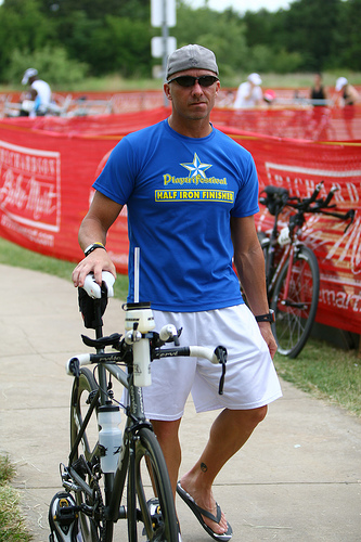 Comments: Run through the sand right to the people with hoses and washed my feet off. I ride sockless and didn't want anything on my feet. Nice gesture by Dallas Athletes for this perk. I ran with Tim (he finished the swim with me...it was kind of cool actually. I hung out with him pre-race, got chipped with him, finished the swim with him, saw him several times on the bike and also ran with him for about 3 miles) and we wished each other well as we entered T1. As usual, there was a group of people outside transition near my bike to tell me that Brian was ahead of me. Hello, the dude is a fish. I will never make it out of the water ahead of him, thanks. Anyway, I remarked that they were supposed to be supporting me, not heckling me. I got my aero lid on, stuffed 2 GU's and a cliff bar in my pockets, strapped my Garmin on, sunglasses on and away I ran to the mount line. What would you do differently?: Pay my supporters more? It was a sub 3 minute transition, so I wasn't too unhappy about it. I wanted to keep total transition time to <5:00 and I accomplished that. Touchdown. ![]() Bike